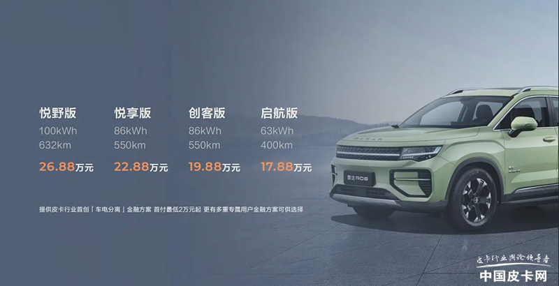 2022年11月9日,国内首款消费级纯电动皮卡雷达RD6正式上市。新车搭载200kW高功率三合一电驱,最大续航里程可达632公里,根据配置不同共分为4款车型,售价区间为17.88-26.88万元。