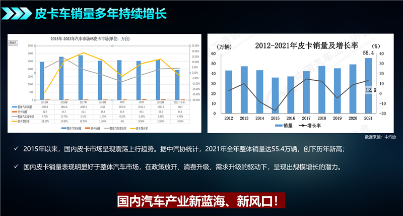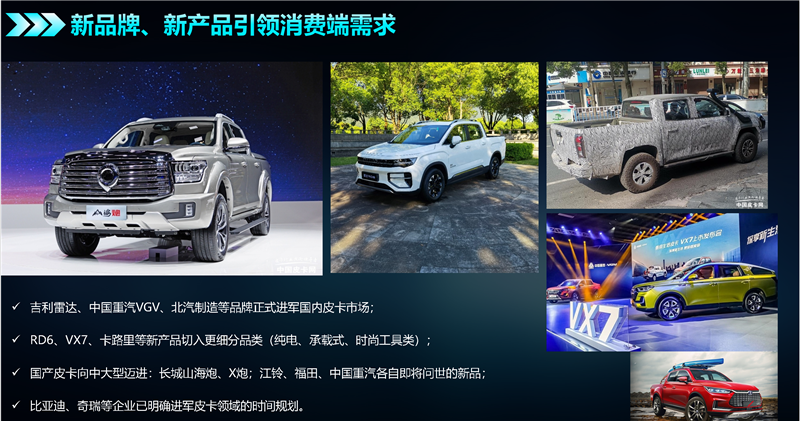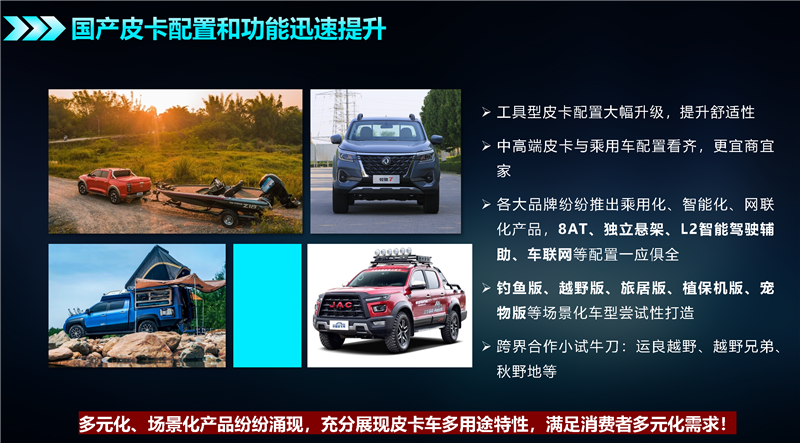 目前,全面放开皮卡进城的信号已经释放,皮卡区域市场正在转变,海外出口猛增,全球化成为新风潮,国产皮卡配置和功能迅速提升,新品牌和新产品不断进入市场,预计在下一阶段,乘用休闲和越野玩乐类产品会有较大增长空间。