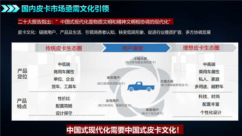 首先,要构建、产出中国式皮卡文化。洞察消费者需求,推出更多满足不同场景应用的车型、产品与服务;引领消费方向,创造新业态、构建多方互动新生态。