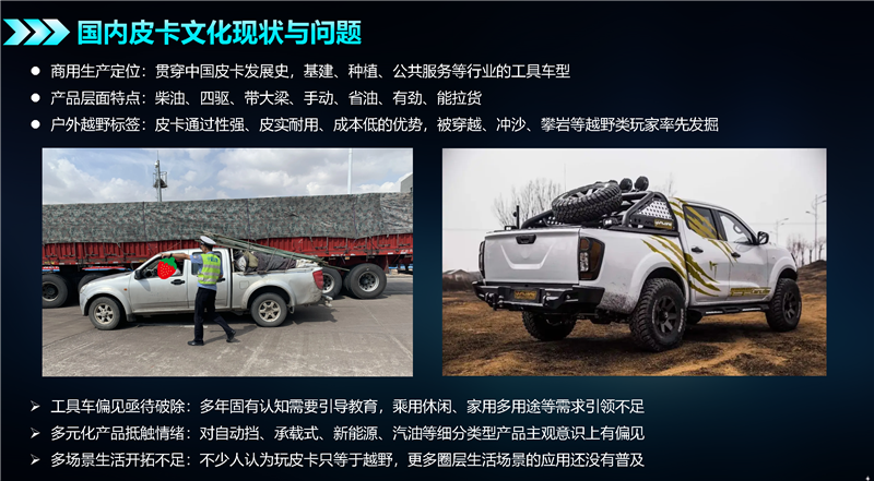 其次,要推广、应用中国式皮卡文化。持续推动皮卡用车环境改善和保有量的提升;扩大圈层范围,提升大众认知;在人文社会层面,构建良好的皮卡用车氛围与舆论环境。