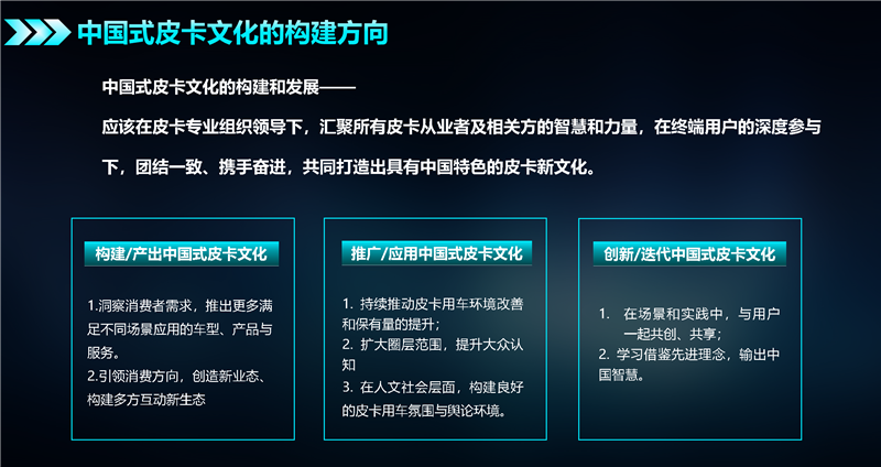 最后,要创新、迭代中国式皮卡文化。在场景和实践中,与用户一起共创、共享;学习借鉴先进理念,输出中国智慧。