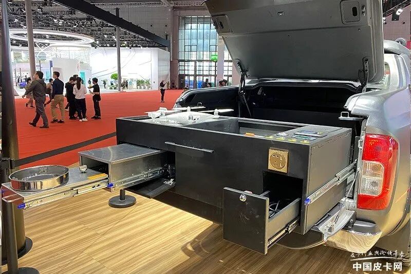 纳瓦拉畅途版的展车采用了磨砂灰的车身颜色,融入了高照射灯、涉水喉、绞盘等诸多硬核元素,车辆后面的货箱与龙门架采用一体式设计,货厢内有一个实用“工具箱”,可以装载一些出行装备。根据配置表显示,这辆展车像是充电口、燃油加热器、水泵、燃气灶、膨胀壶、压力罐、抽拉箱、无人机、餐具箱、压力加水口/出水口等均有配备,可以满足户外的多种生活需求。
