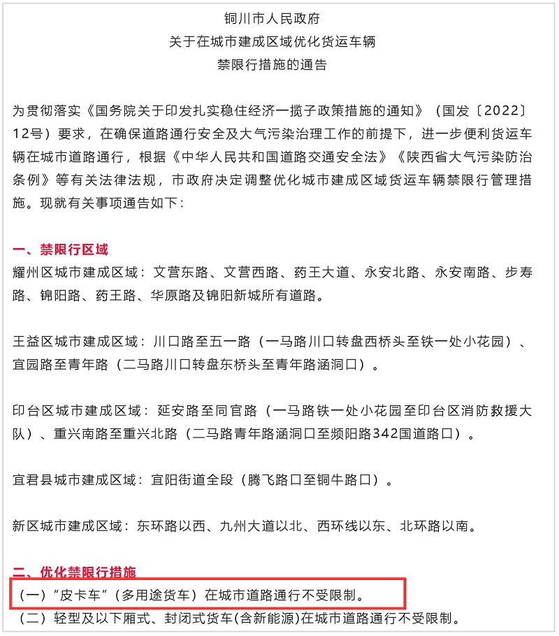 11月15日,陕西省铜川市发布通告,决定调整优化城市建成区域货运车辆禁限行管理措施,明确提出“皮卡车”(多用途货车)在城市道路通行不受限制,这是继省会西安之后,陕西第二个官宣解禁的城市。