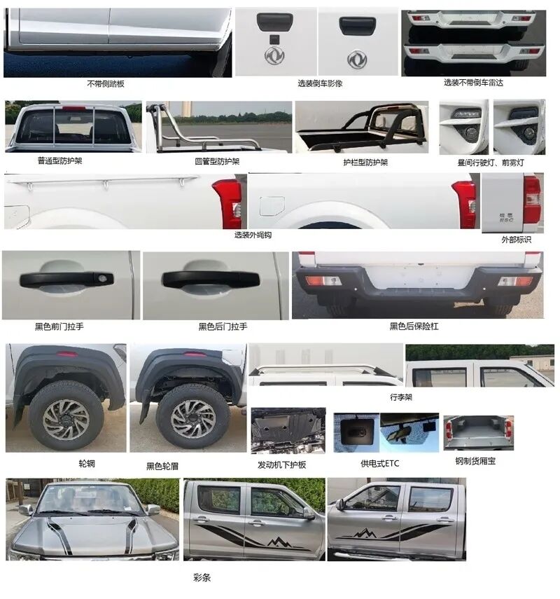新车将配置方面将提供又倒车影像、钢制货箱宝、直接供电ETC、龙门架以及黑色轮眉等。车身尺寸可能因为配置的不同,存在差异,其中选装行李架时车高1805mm,选装护栏型防护架时车高1738mm,选装普通型防护架时车高1725mm,选装黑色轮眉时车宽为1842mm。
