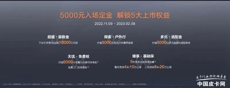 11月9日,国内首款消费级纯电动皮卡雷达RD6正式上市。新车根据配置不同分为4款车型,售价区间为17.88-26.88万元。而自上市之日起至2023年2月8日,用户可享5000元入场定金解锁5大上市权益,包含5000抵10000元车款、5000元多元户外露营套装等。