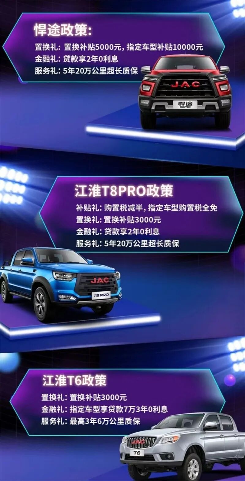 即日起至12月31日,江淮皮卡开展“年终惠战,新品狂欢购”活动,针对旗下全系产品悍途、T8 PRO、T6等皮卡产品提供置换礼、金融礼、服务礼等优惠,最高可优惠一万元。