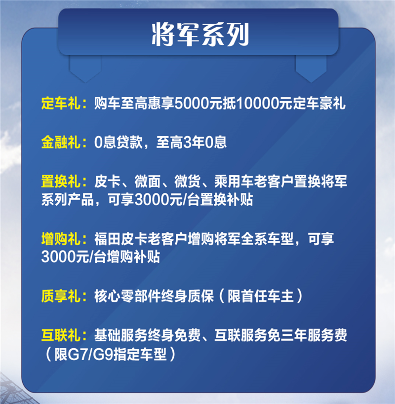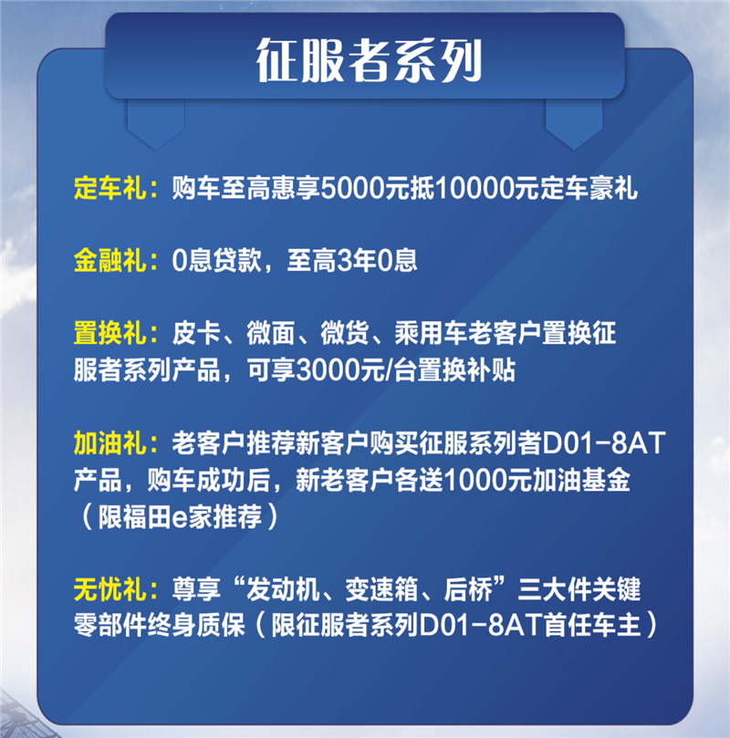 近期,福田皮卡上线了专属APP皮卡生活,并推出年终优惠礼包。12月1日-31日,福田针对将军系列和征服者系列提供定车礼、金融礼、置换礼、增购礼等,购车至高惠享5000元抵10000元定车礼包,核心零部件还可终身质保。
