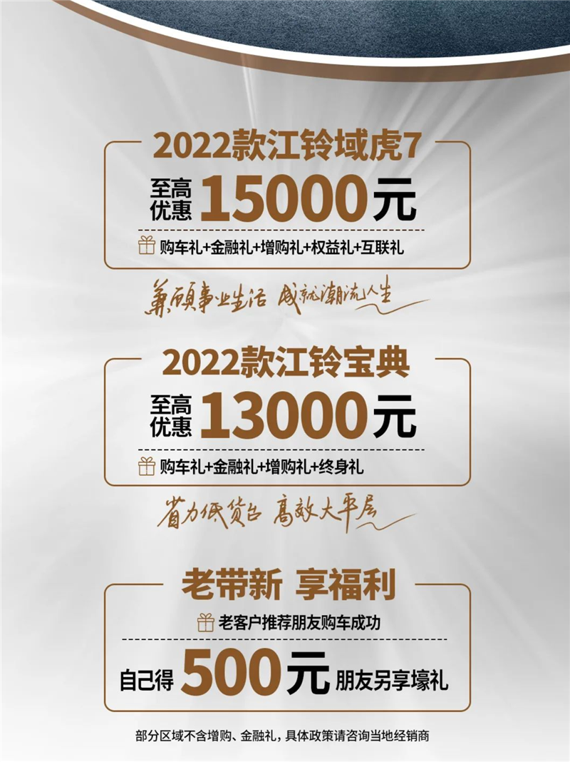 江铃皮卡十二月钜惠来袭,针对旗下域虎7、宝典车型,提供购车礼、金融礼、增购礼等多重补贴,并可叠加享受老带新福利,其中域虎7车型至高优惠1.5万元,宝典至高优惠1.3万元。