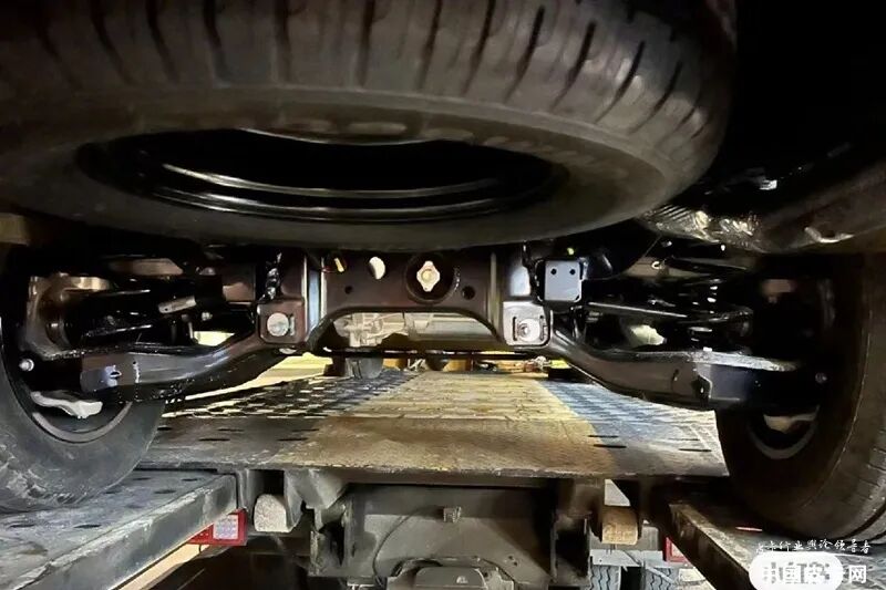 车辆尾部比较常规,尾门上方带有灯带,预计有可能是高位刹车灯。尾灯造型比较方正。保险杠两侧带有反光条。从后悬架部分可以看出,该车配备了螺旋弹簧多连杆独立悬架,并且后桥中部带有电机,从而意味着这款是一款四驱车型。