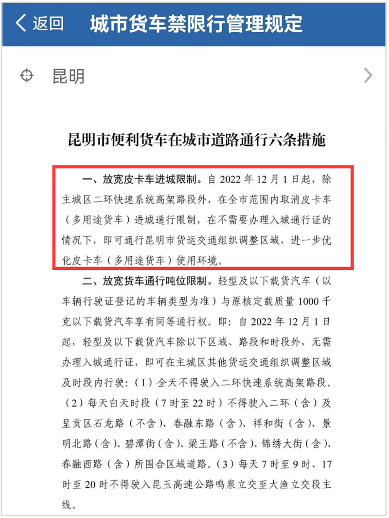 《昆明市便利货车在城市道路通行六条措施》中再次提出“放宽皮卡车进城限制”,具体为:自2022年12月1日起,除主城区二环快速系统高架路段外,在全市范围内取消皮卡车(多用途货车)进城通行限制,在不需要办理入城通行证的情况下,即可通行昆明市货运交通组织调整区域,进一步优化皮卡车(多用途货车)使用环境。