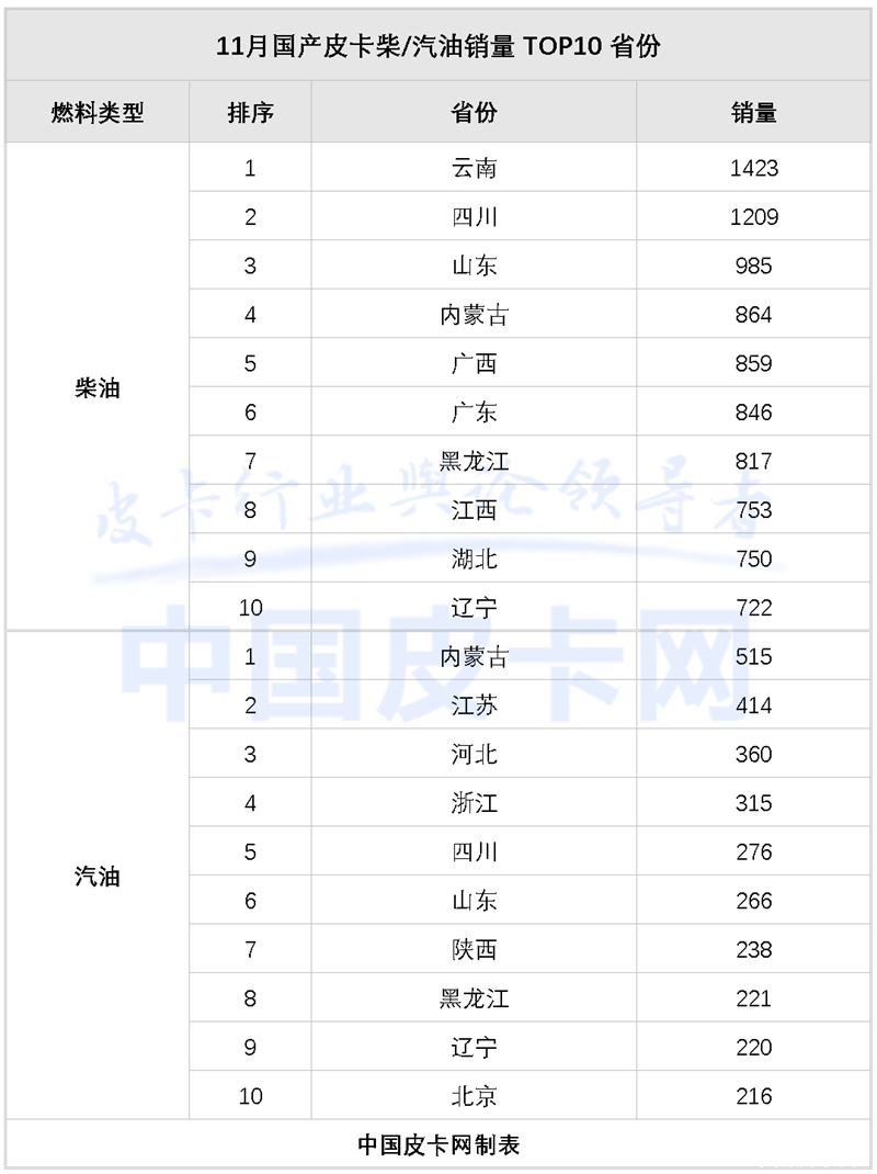 11月,柴油皮卡依然占据主要市场,市占率高达76.4%,表现平稳,而随着内蒙古、江苏、浙江、黑龙江等地汽油皮卡销量的提升,汽油皮卡的占比也小幅上涨。值得一提的是,11月,纯电动皮卡售出333辆,其中广东省占据54%的份额,山东、四川、广西的纯电动皮卡需求有所提升,福田、郑州日产、长城皮卡是纯电动皮卡的主销品牌。