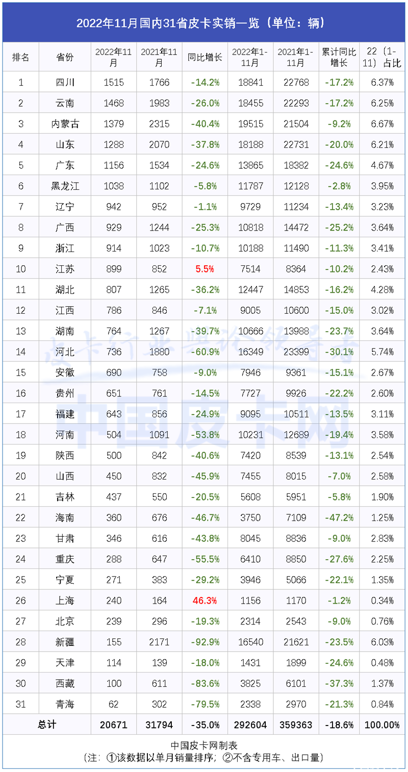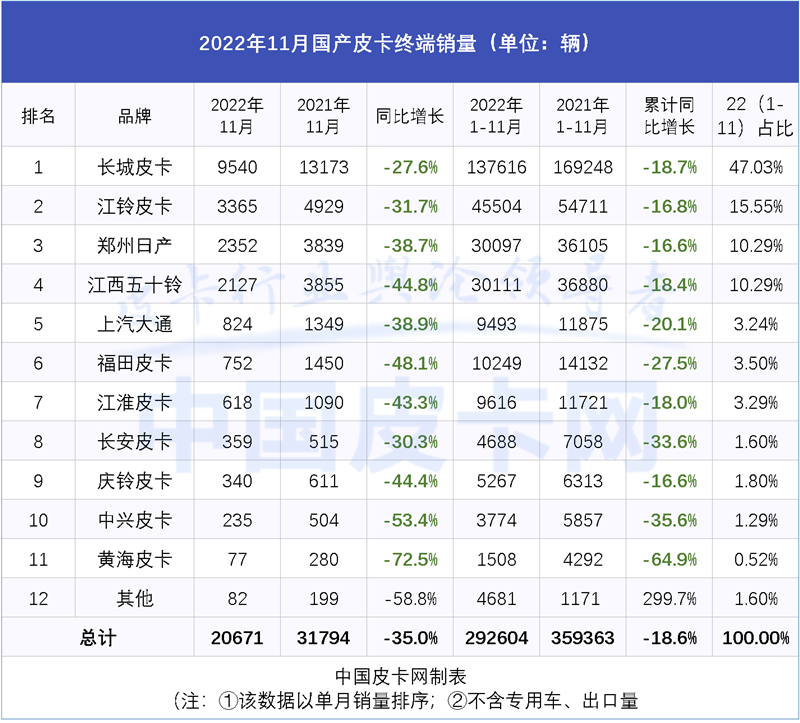 近日,中国皮卡网获得了国内皮卡最新终端销量数据,2022年11月,国产皮卡终端上险量为20671辆,同比下降35%;1-11月累计上险量为292604辆,累计同比下降18.6%。中汽协分析指出,今年11月,经济下行压力不断加大,疫情对汽车消费市场产生冲击,消费者购车需求释放受阻,终端市场表现疲软,供给端节奏放缓,为汽车市场稳定运行带来较大压力。