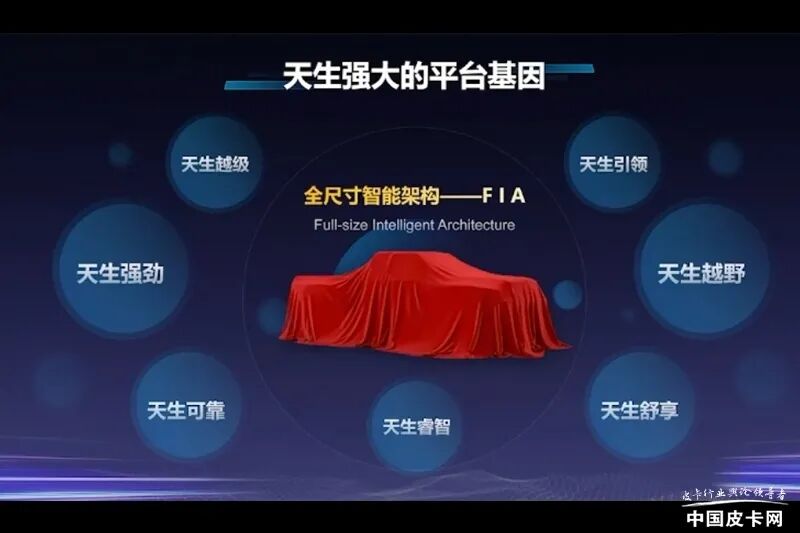 福田皮卡新一代全尺寸平台官方称为“FIA全尺寸智能架构”, 新平台将会给新产品带来全方位的升级,突出七大特点:天生越级、天生强劲、天生引领、天生越野、天生舒适、天生睿智、天生可靠。