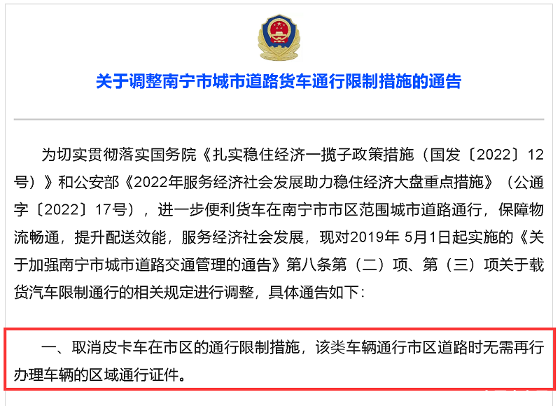 近日,南宁交警发布《关于调整南宁市城市道路货车通行限制措施的通告》,2023年1月1日起至2024年4月30日,取消皮卡车在市区的通行限制措施,该类车辆通行市区道路时无需再行办理车辆的区域通行证件。