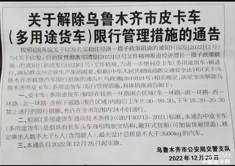 近日,有卡友发来消息,乌鲁木齐市公安局交警支队发布了《关于解除乌鲁木齐市皮卡车(多用途货车)限行管理措施的通告)》,提出为进一步便利皮卡车(多用途货车)辆通行,满足群众与企业生产生活需要,决定自2022年12月25日起,全面解除乌鲁木齐市皮卡车(多用途货车)限行管理措施,允许在全市范围内24小时通行。