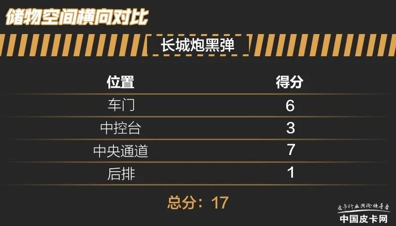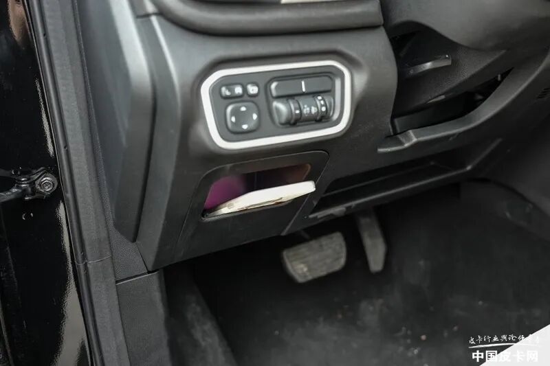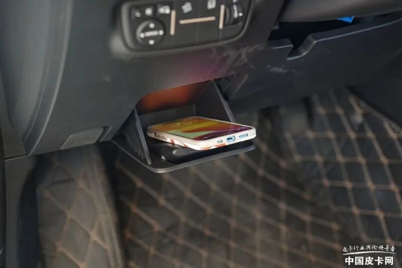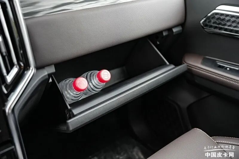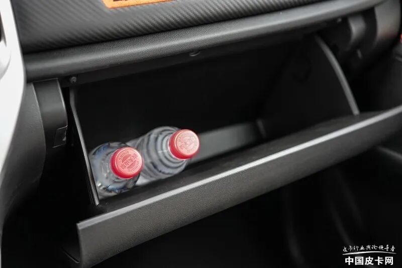长城黑弹中控台最左侧设计有储物槽,可放置手机等小物件,+1分;方向盘下方位置非常巧妙的设计有储物槽设计,空间较大,此处+1分;副驾驶手套箱为常规设计,此处+1分。长城炮黑弹中控台储物能力总计3分。