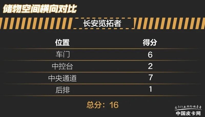 长安览拓者中央通道前方可放置手机,此处+1分;中央通道下部带有镂空设计,此处空间非常大,并带有USB与12V电源接口,此处+2分;中央通道中部提供有两个杯槽设计,后方还有一个储物槽设计,可放置手机等小物件,此处+3分;中央通道后方扶手箱空间比较常规,此处+1分;长安览拓者中央通道储物能力总计7分。