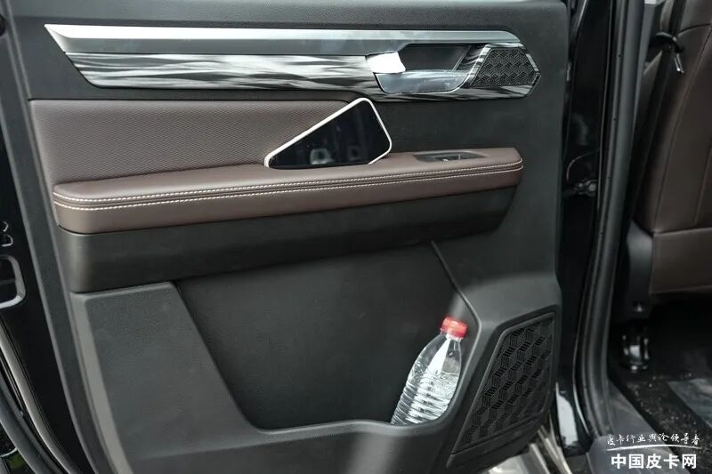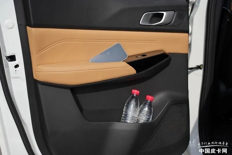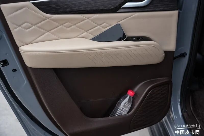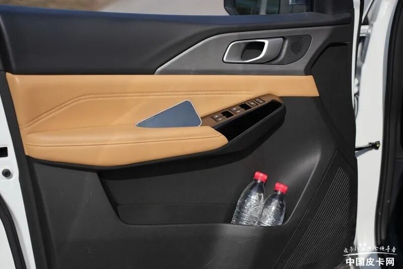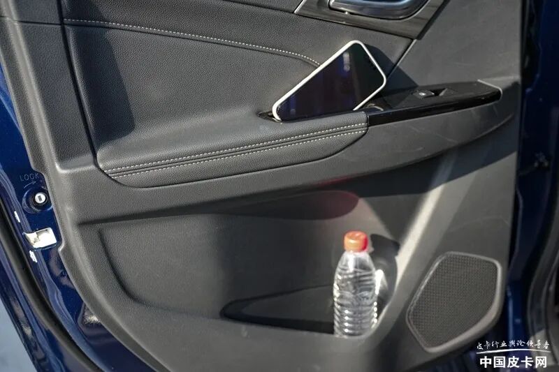 郑州日产锐骐7,前门为封闭式拉手,此处放置手机,+1分;下方水杯槽空间较为常规,可放置1瓶矿泉水,+1分。后门与前门情况相同,封闭式拉手,此处可放置手机等小物件,+1分;下方水杯槽空间较为常规,可放置1瓶矿泉水,+1分。郑州日产锐骐7车门储物能力总计4分。