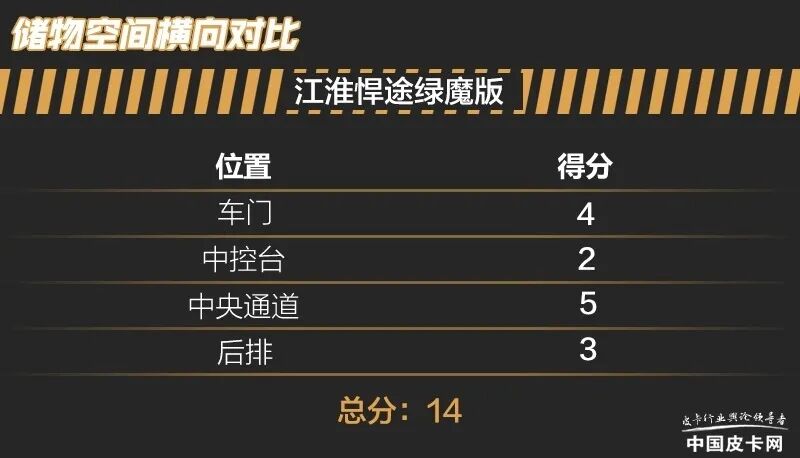 江淮悍途绿魔版最左侧设计有储物槽,可放置手机等小物件,+1分;副驾驶手套箱为常规设计,此处+1分。江淮悍途绿魔版中控台储物能力总计2分。