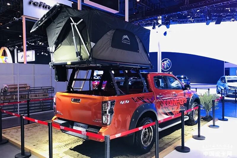 在成都车展的江西五十铃展台,我们发现了一台旅装版的D-MAX,该车基于今年最新上市的全新D-MAX打造,在货厢处高位增加了一个车顶帐篷,通过其底部支撑的钢性结构可以看出该顶帐具有较强的实用性。顶帐下方还保留有一定的货箱空间,便于装载货物。此外,旅装版D-MAX还改装了车辆轮眉、轮毂样式等细节,增加了该车的多样化能力。动力方面,旅装版D-MAX依然搭载ISUZU原装劲蓝动力RZ4E 1.9T柴油发动机,最大功率120kW,最大扭矩360N·m。