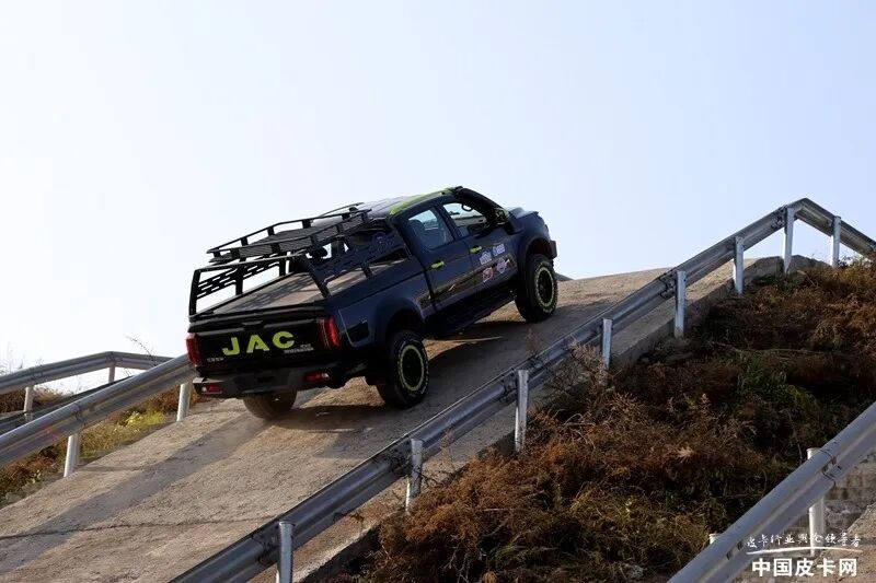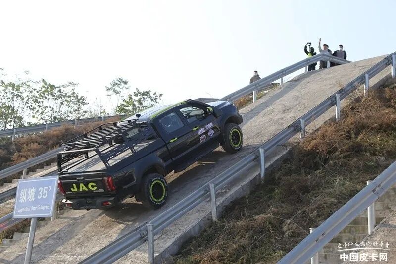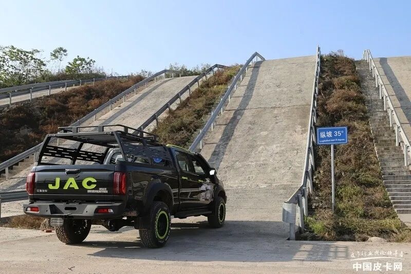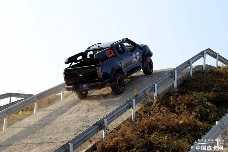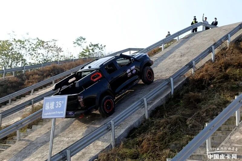 爬坡也是很多皮卡经常遇到的一种情况,而作为越野方向的改装皮卡,爬坡更是家常便饭。在这项测试中不仅考验皮卡的轮胎抓地能力,同时还受到车辆动力和驱动方式的影响。在中国汽研的场地中难度最大的坡度为35°纵坡,但采用水泥路面铺设,与户外的实际坡道相比摩擦系数更大一些,也更能考验车辆的理论极限值。在实际评测中的指标有两个,首先是是否能成功爬坡登顶,其次是爬坡所用时间长短。