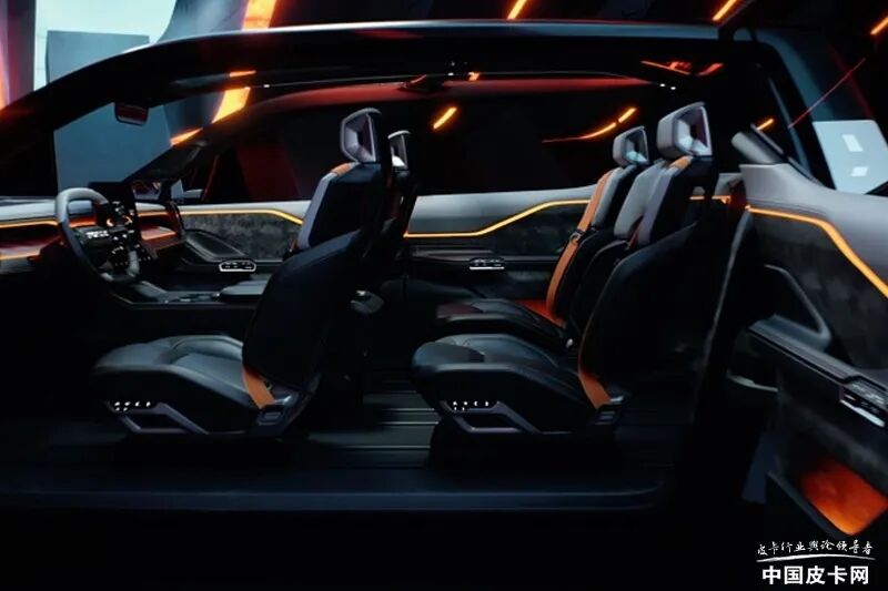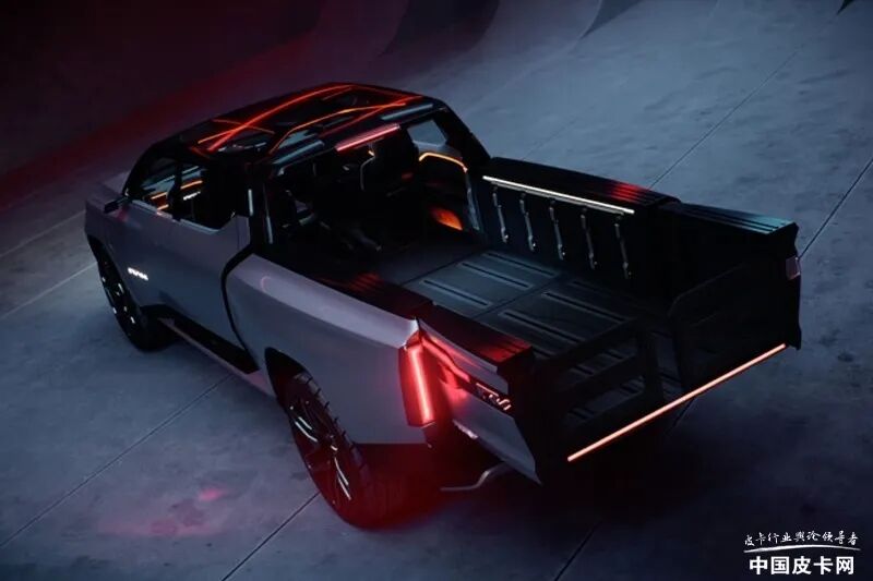 车辆尾部的灯组十分具有辨识度,与车头的灯组相呼应,进一步提升车辆的科技感。此外,车辆的对开式尾门将进一步扩展装载空间,允许货物最大长度为18英尺。新车还配备了24英寸轮圈及外径35英寸的轮胎,配合空气悬架使用,支持进出、空气动力及越野模式。