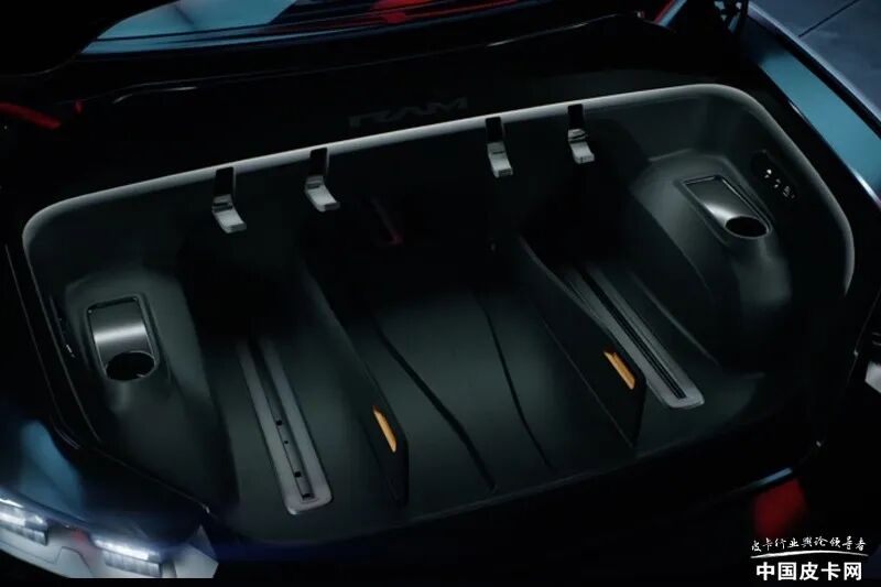 自1981年问世以来,道奇RAM就肩负起了对垒福特F系列的重任。凭借着粗犷威猛的造型和极佳的实用性,RAM也确实给福特F系列带来了不小的压力。现在市场上F-150 Lightning风头正盛,RAM Revolution电动皮卡这个时候到来似乎目的十分明显。外观方面,新车保留了传统皮卡的粗狂与力量感,又加入了电动汽车干净、简洁的印象设计。车头中间巨大的RAM标识十分醒目,两侧的日行灯纵向延展,科技感强烈。“机舱”内部存在一个巨大的前备箱存储空间。