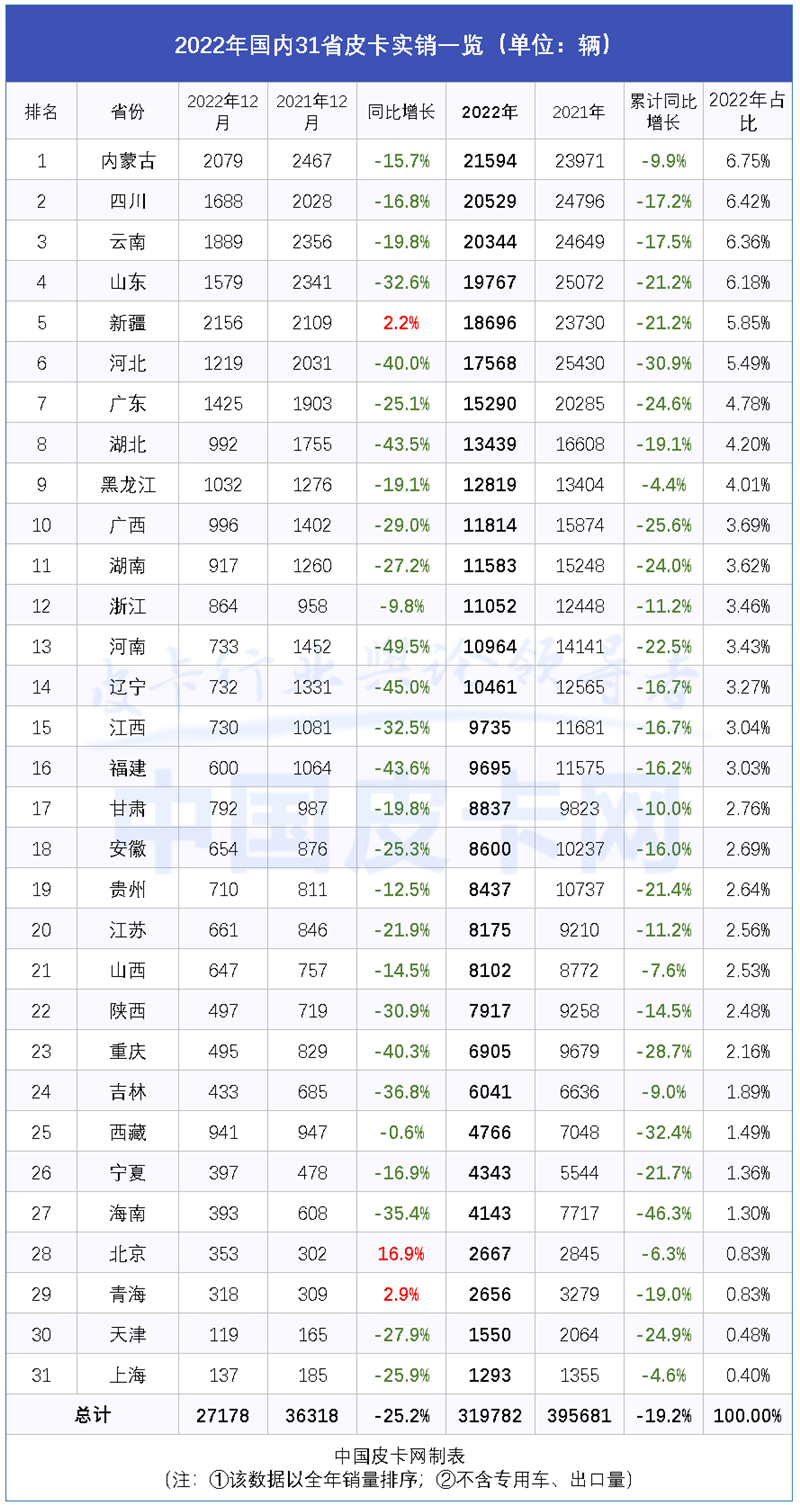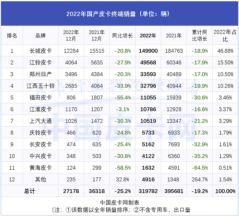 2022年已经远去,又到了公布全年成绩的时刻。根据中国皮卡网获得的国内皮卡终端销量数据显示,2022年12月,国产皮卡终端上险量为27178辆,同比下降25.2%;全年累计上险量为319782辆,累计同比下降19.2%。