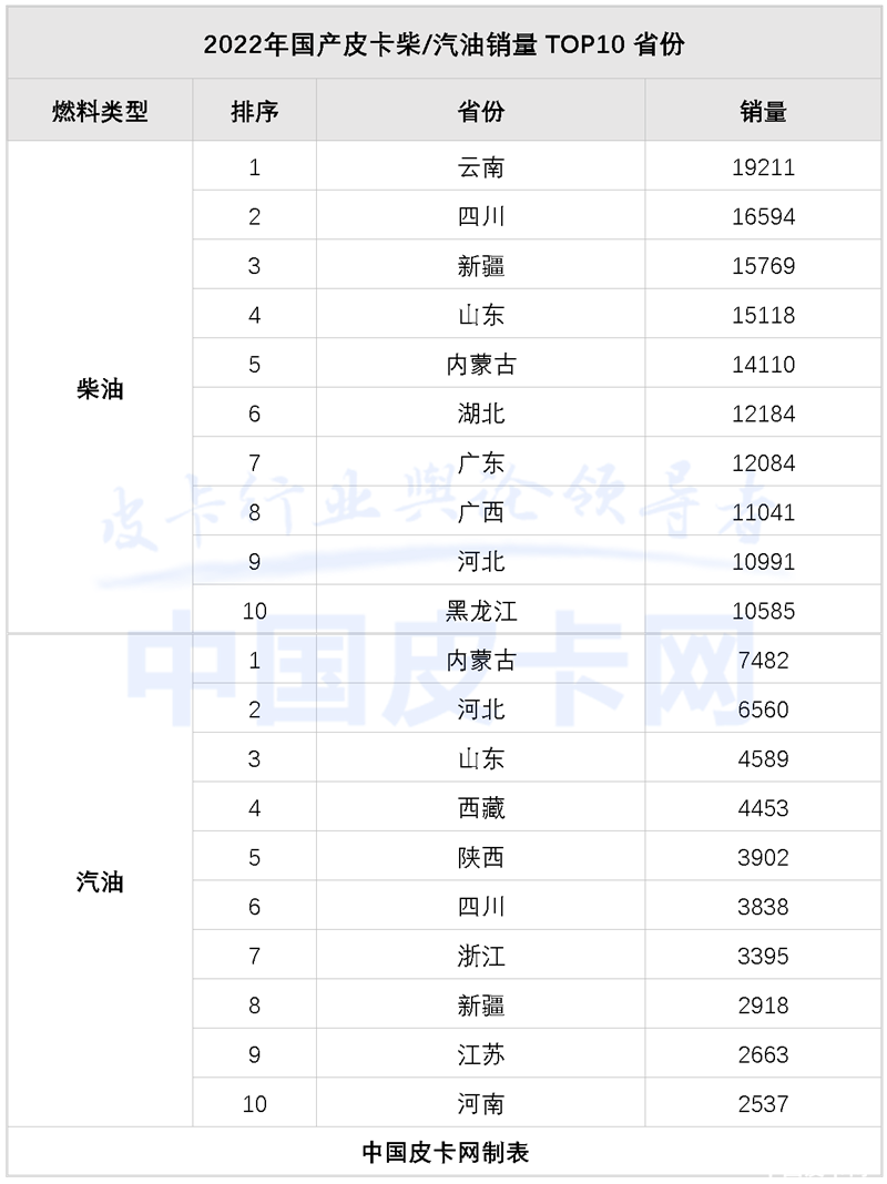 2022年,柴油皮卡依然占据主要市场,市占率高达77.6%,表现平稳,而随着内蒙古、河北、山东、浙江等地汽油皮卡销量的提升,汽油皮卡的占比也小幅上涨。值得一提的是,2022月,纯电动皮卡售出2174辆,其中广东省占据33.5%的份额,云南占据17%的份额,江苏、广西、海南的纯电动皮卡需求有所提升,郑州日产、福田、长城是纯电动皮卡的主销品牌。