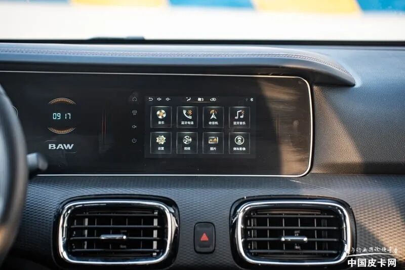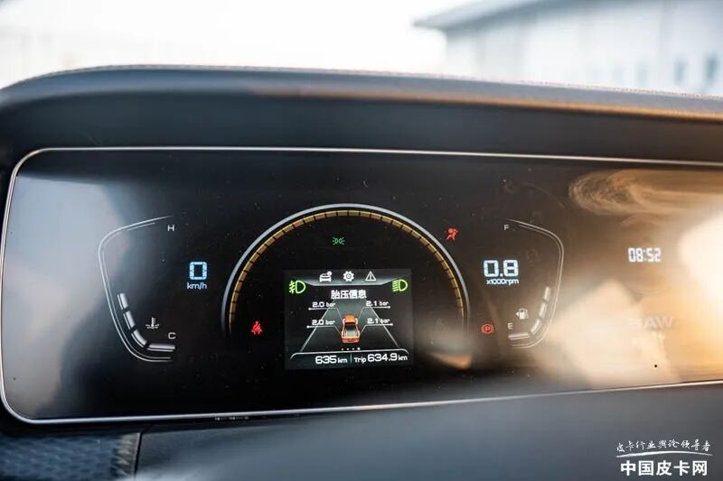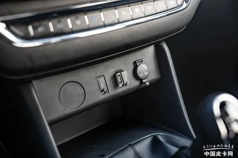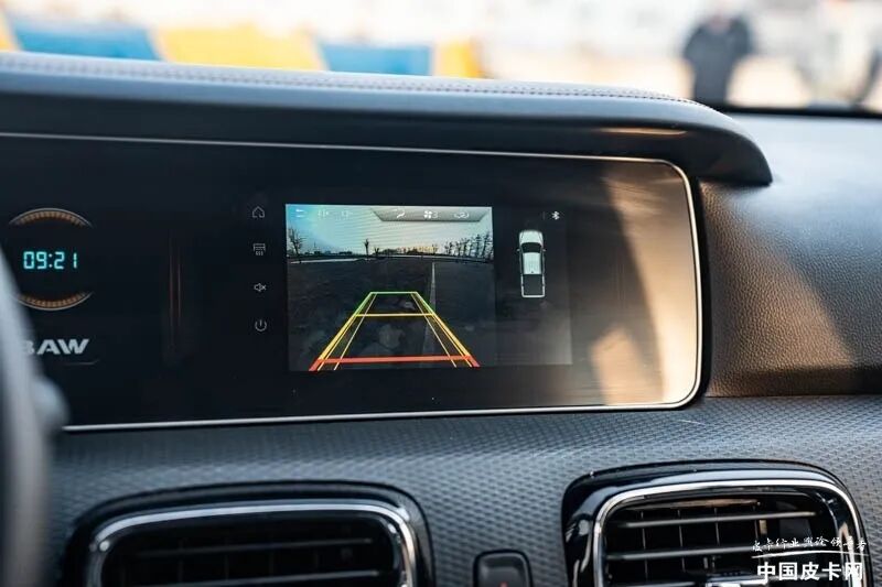 在人机交互方面,官方介绍是10.25英寸的双联屏设计,不过我在现场试驾的车来看,应该为中配车型,所以不管是仪表,还是中控屏幕,并非10.25英寸。虽然中配车型只有7英寸屏幕,不过液晶屏与数显屏之间的结合,也让它的整体视觉观感有了很好的提升。同时,仪表可以显示详细的行车信息,中控彩屏也具备了基本的多媒体、蓝牙、图片、视频功能,屏幕操作流畅度也很好,相比10万元以内皮卡仍然是数显单色车机来看,卡路里车机已经很好了。