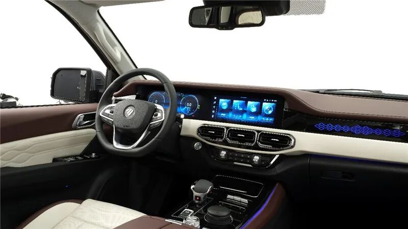 大家关心的肯定是其动力系统,这也是福田全新一代平台的一大特点,将会有混动系统。混合动力发动机排量为2.0L及2.5L,混动方式将会提供48V轻混和DHT重混。和博世联合开发48V柴油轻混系统,扭矩达450N·m,全系将标配采埃孚8AT变速箱。同时,全新平台还有纯电和增程纯电产品,其中纯电产品100度电池,续航达600km以上;纯电增程产品,总续驶里程达到900km以上。此外,全新平台将搭载智能四驱、三把锁、氮气减震、全地形轮胎等配置也应有尽有。对了,这台车预计还将配备多连杆后悬架,与其高端舒适的定位吻合。