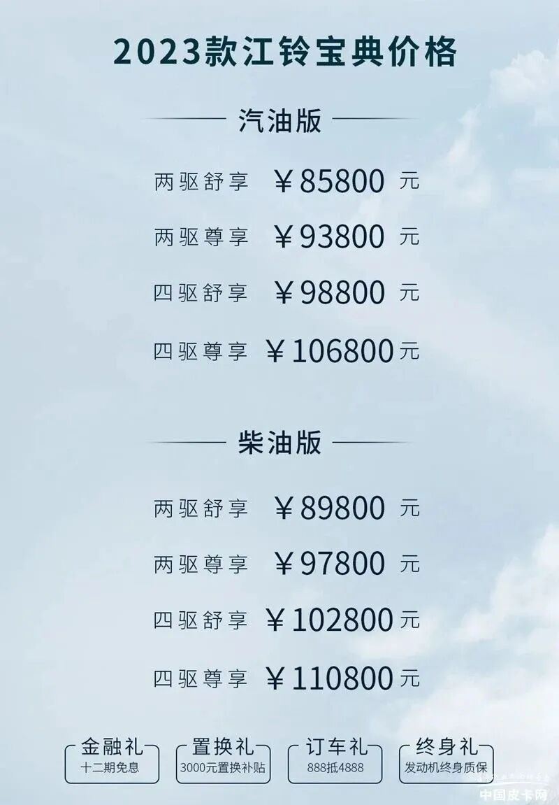1月初,江铃皮卡宣布旗下2023款宝典正式上市,新车在外观内饰部分都有比较明显的升级,动力依然有汽柴油两种选择,标轴车型售价区间为8.58-11.68万元,长轴车型在标轴车型基础上增加1500元,长轴舒享平底货箱车型在长轴车型基础上增加1000元。