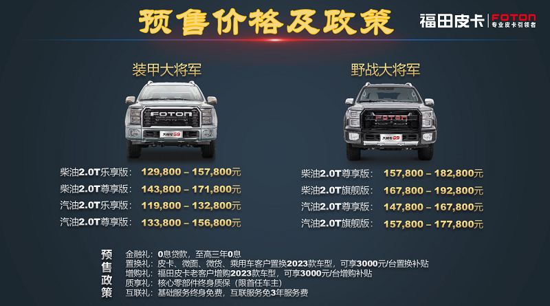 1月初,2023款大将军皮卡在贵阳等多个区域上市,其预售价格得到公布。此次新车分为装甲大将军柴油、装甲大将军汽油、野战大将军柴油以及野战大将军汽油共四个版本车型,预售价区间11.98万-19.28万元。