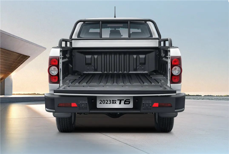 2023款江淮T6柴油版在外观上与现款车型保持一致,X型前脸、越野式竖格栅、分体式熏黑前大灯及红色JAC标识很有辨识度;车内同样主打简约时尚风格,中控台布局规整,三幅多功能方向盘、双炮筒式自发光仪表更显动感。新车采用了江淮皮卡擅长的平底货箱结构,更加利于货物的装卸,货箱配有实用型龙门架,集成有10枚货箱绳钩。