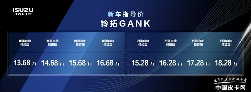 2022年5月10日,江西五十铃铃拓GANK汽油版正式上市,共推出8款车型,官方指导价13.68万—18.28万元。
