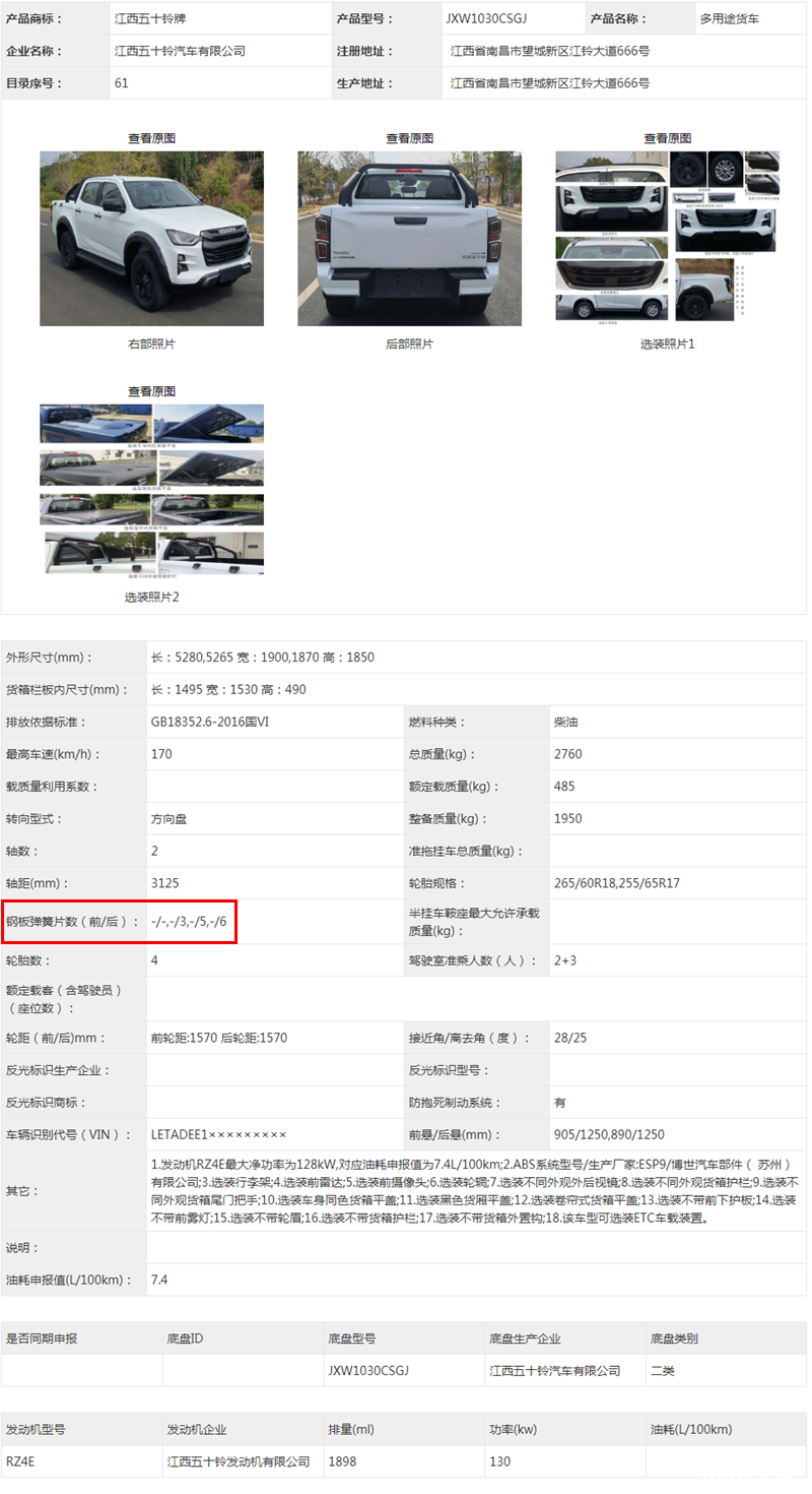 江西五十铃新款D-MAX也出现在了最新的申报信息当中,其基本上延续了现款的外观设计,增加了货箱盖、轮眉等配置。而值得注意的是,新款车型在申报信息中后钢板弹簧片数有3/5/6片的规格,另外还有一种不带钢板弹簧的规格。我们猜测该车很有可能为高配车型配备螺旋弹簧多连杆后悬架,这也是部分乘用化皮卡的常规操作。动力方面保持不变,依然搭载RZ4E 1.9T柴油发动机,最大净功率为128kW,对应油耗申报值为7.4L/100km。