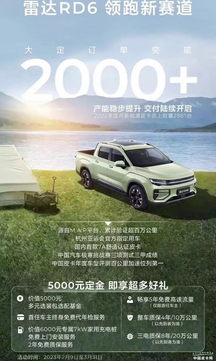 去年11月,国内首款消费级纯电动皮卡雷达RD6正式上市,新车搭载200kW高功率三合一电驱,最大续航里程可达632公里。从上市至今,RD6累计大定订单量已经突破2000+台,相当于2022年国内新能源皮卡上险量的近八成,足见其受欢迎程度。随着销量的走俏,雷达官方也在持续优化用户体验,给予车主全方位的照顾,其中包括首任车主终身免费代检、充电桩免费上门安装、整车质保、三电质保等多项活动(详见如下)。