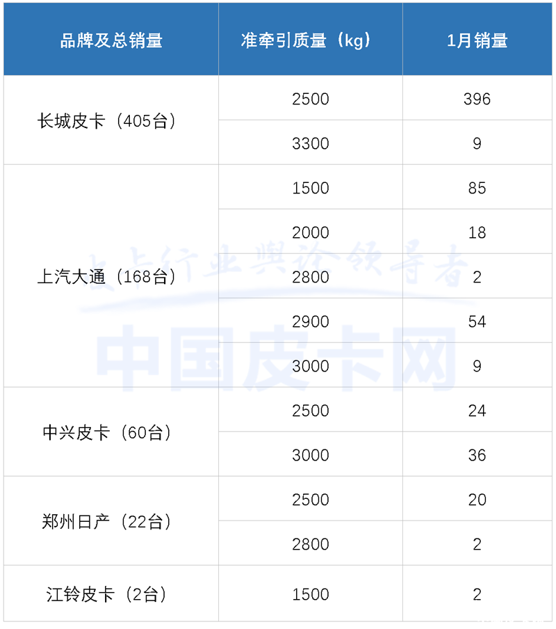 此外,我们还获得了1月拖挂版皮卡的具体销量,其中,长城皮卡拖挂版最为畅销,上汽大通次之,2.5吨和3吨牵引资质需求最强。