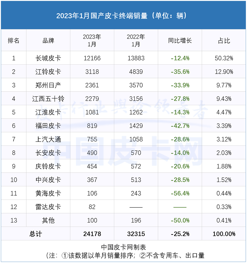 根据中国皮卡网获得的国内皮卡终端销量数据显示,2023年1月,国产皮卡终端上险量为24178辆,同比下降25.2%。受年末厂家冲量效应、今年春节假期提前至1月等因素影响,企业生产经营时间减少,卖车时间有限,加之消费者需求提前透支,国产皮卡1月终端上险量呈下滑态势,整体国内汽车市场均未能迎来开门红。