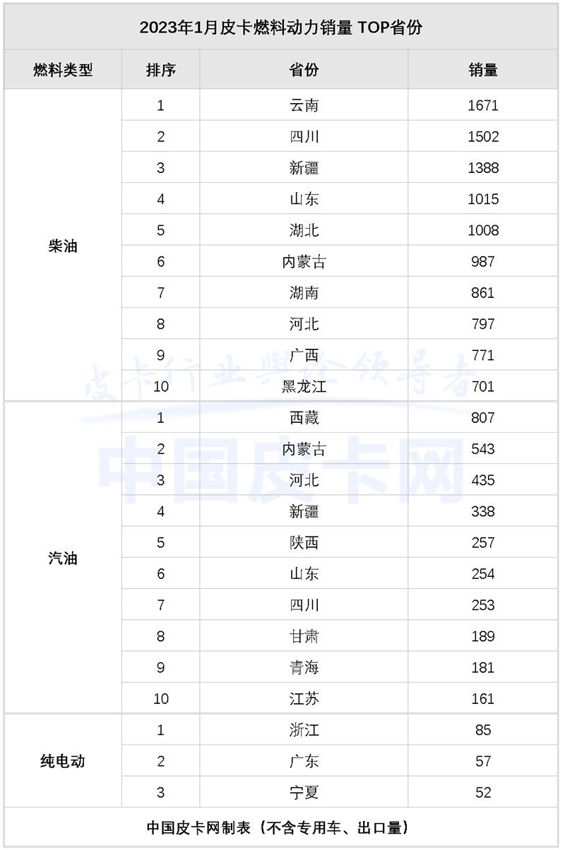 从区域表现来看,1月,传统皮卡强省四川以1766辆的成绩拔得榜单头筹,云南、新疆、内蒙古等解禁大省同样发挥稳定。而陕西、天津等地在1月逆势增长,去年年末,陕西省会西安全面放开皮卡进城,天津也在2023年年初正式放宽外地号牌皮卡通行限制,均有效提振了用户消费信心,发挥了不错的销量刺激作用。