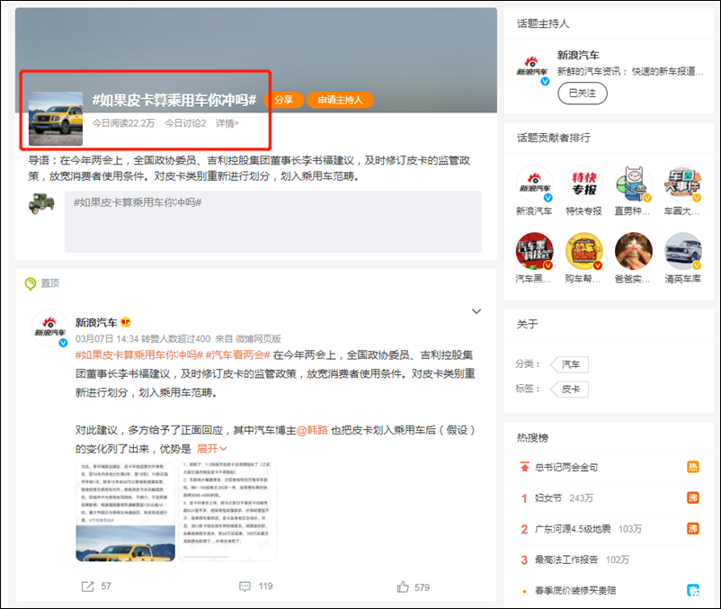 最近,皮卡变成了“两会”热词,全国政协委员、吉利控股集团董事长李书福提出“对皮卡类别重新进行划分,划入乘用车范畴”;随后,全国人大代表、小米集团创始人雷军同样提出“放宽皮卡进城等品类限制,等同于乘用车管理规范”。一石激起千层浪,在微博上,也有#如果皮卡算乘用车你冲吗#这个相关话题被各大汽车媒体或KOL账号炒起来。