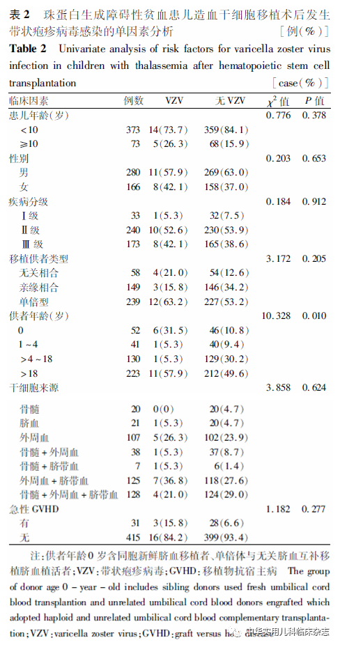 结果2.1 VZV感染发生情况及危险因素分析 446例珠蛋白生成障碍性贫血患儿随访至2021年6月,其中有19例发生VZV感染,总发生率为4.3%。其中男11例,女8例。移植供者类型:单倍型移植者12例,亲缘相合者3例,无关相合者4例。干细胞种类:骨髓0例,新鲜脐带血1例,外周血5例,外周血+骨髓1例,骨髓+脐带血1例,外周血+脐带血7例,骨髓+外周血+脐带血4例。VZV感染发生与供者年龄有关(P=0.010),供者年龄0岁为危险因素,其包含同胞新鲜脐血移植供者、单倍体与无关脐血互补移植脐血植活供者。与患儿年龄、性别、疾病分级、移植供者类型、干细胞来源、移植后是否发生急性GVHD无关(均P>0.05)(表2)。