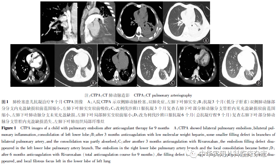 讨论静脉血流淤滞、血液高凝状态和血管壁内皮损伤是静脉血栓形成的危险因素,即Virchow三要素,包括遗传性和获得性两类。近年随着中心静脉置管、感染高凝状态、制动等因素及影像诊断技术进步和对疾病认知的更新,儿童血栓报道增多[6]。本例报道30例患儿中仅 1例诊断为PSD,余29例未检测到凝血因子缺乏,NS和肾炎基础疾病应用激素伴随高凝状态,余患儿肺栓塞均与重症感染相关,其中23例符合RMPP诊断,1例为金黄色葡萄球菌败血症,1例为先天性心脏病合并嗜血杆菌感染。本课题组既往曾报道另外2例RMPP合并肺栓塞儿童病例[7]。本研究中支原体肺炎相关肺栓塞以2021年诊断最多,可能与2021年中国北方MP感染周期性流行高峰有关。研究报道儿童重症支原体感染引起血液高凝状态与以下因素相关:(1)机体受到病原菌及其毒素直接损伤引发炎症反应,机体微血管内皮损伤,同时激活凝血系统,使局部纤维蛋白生成增加、降解减少,引起肺部高凝状态及微血栓形成[8]。(2)MP抗原与人体脑、肝、肾、关节、心脏等存在共同抗原,促使机体产生自身抗体,进而形成免疫复合物,导致呼吸道及肺外其他器官损伤,或MP激活补体进而激活凝血系统[8]。本研究23例RMPP患儿均合并心血管系统、消化系统、外周血管系统、神经系统、血液系统等除呼吸系统外至少2个系统损伤。重症肺炎和肾病患儿急性期多卧床休息,特别是监护室治疗期间,本研究中4例患儿曾有监护室住院经历,造成了主动“制动”因素,推测以上为患儿肺栓塞及其他器官合并血栓的危险因素。典型肺栓塞具有急性呼吸困难、胸痛、咯血“三联征”,儿童肺栓塞缺少特异性临床表现,可无症状、非特异性症状、轻至重度低氧血症、右心衰竭、休克甚至死亡,主要取决于栓子大小、数量、栓塞部位及患儿是否存在心、肺等器官的基础疾病,难以在短时间做出正确诊断。研究表明胸痛、呼吸困难和咳嗽是儿童肺栓塞最常见症状,52.0%~84.0%存在胸痛,44.0%~87.5%存在呼吸困难,32.0%~62.5%存在咳嗽,咯血症状比例悬殊,占4.0%~33.0%[9-10]。一般情况下,只有大面积肺栓塞会引起典型症状,而较小栓子临床表现轻微。小年龄儿童不能叙述气短或胸痛,而且心肺功能储备很好,可使大面积肺栓塞对血流动力学的影响最小化。本研究患儿自发病至肺栓塞确诊时间为1~28 d[(12.8±6.1) d],仅2例患儿表现为明显呼吸困难需要呼吸支持,7例患儿需要低流量吸氧。咳嗽、发热是最常见症状,早期识别与肺部原发感染难以区分,其次是气促、胸痛、咯血。27例(90.0%)有气促表现,警示任何年龄组儿童出现不能解释的呼吸急促提示肺栓塞的可能。值得注意的是有4例患儿虽无咯血表现,但在支气管镜检查均发现血性分泌物,随后CTPA确诊肺栓塞。近年支气管镜技术发展有助于发现肺部隐匿性出血和肺栓塞。患儿CT均表现为大片实变/肺不张,24例(80.0%)有胸腔积液,提示肺实变和胸腔积液是肺栓塞最常见的间接征象。本研究中双侧和单侧栓塞部位均涉及下肺动脉分支,4例实变影在右肺,栓塞位于对侧左下肺动脉分支,提示PTE有下叶分布趋势,实变影与血管栓塞位置并不完全一致,与既往报道一致[10]。D-二聚体是近年受到重视的体内高凝状态和特异性纤溶过程标志物,血栓形成时D-二聚体因纤维蛋白溶解而浓度升高[3]。本研究21例(70.0%)D-二聚体明显升高≥5.0 mg/L,8例(26.7%)患儿D-二聚体2.5~5.0 mg/L,仅1例PSD患儿D-二聚体处于正常范围,D-二聚体在本研究PTE患儿中敏感性高。Rajpurkar等[1]研究认为虽然大约85%的PTE患儿D-二聚体升高,但对肺栓塞诊断没有鉴别意义。D-二聚体特异性较低[11-12],其他肺部疾病,如肺炎、慢性阻塞性肺病等呼吸系统良性疾病,由于反复感染、缺氧、二氧化碳潴留等因素影响,导致肺组织损伤、凝血功能出现异常。Kanis等[13]研究9个临床变量(心率、呼吸频率、血氧饱和度、近期手术肢体肿胀、活动性肿瘤、制动、中心置管和既往静脉血栓)用于儿童PTE的临床概率评分系统,如果以上皆为阴性,结合阴性D-二聚体值,对PTE阴性的预测为100%。因此对D-二聚体增高的患儿需警惕血栓,及时进行其他相关辅助检查排除肺栓塞。肺栓塞患儿需尽早接受治疗。抗凝治疗为PTE基础治疗手段,其他治疗方法包括大面积PTE的溶栓治疗、急性PTE介入治疗,对于抗凝治疗、溶栓治疗失败或有禁忌证者,可考虑手术切除肺动脉血栓[14]。血流动力学稳定患儿应接受抗凝治疗。胃肠外初始抗凝(包括肝素、低分子肝素等)治疗启动后,应根据临床情况及时转换为口服抗凝药物[14-15]。本研究患儿急性期应用肝素/低分子肝素后,4例患儿口服华法林,17例患儿口服利伐沙班。维生素K拮抗剂类药物华法林是目前儿童常用口服抗凝药物,需要经常监测国际标准化比值(INR),华法林的抗血栓形成最大效应时间为144 h(6 d),所以华法林应在胃肠外初始抗凝当天同时启用,在2.0≤INR≤3.0且保持稳定至少24 h后,可停用[15]。利伐沙班是DOACs类Ⅹa因子抑制剂代表药物,关于利伐沙班EINSTEIN-Jr儿童 Ⅰ~Ⅲ 临床试验均已完成[16-18]。与传统抗凝剂华法林相比,利伐沙班生物利用度高,起效快,固定剂量服用,不需要频繁采血监测INR调整剂量和饮食限制,经济负担少,在儿童应用具有很大优势[14]。本研究17例患儿完成口服利伐沙班抗凝治疗,随访期间均无出血、肝肾功能损害等不良反应。1例 PSD患儿曾于外院口服华法林,但治疗效果欠佳,