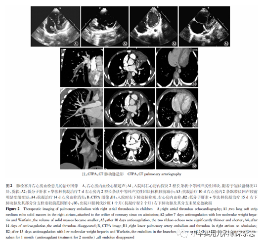 结果2.1 一般情况 30例患儿中男17例,女13例,男女比例为1.31∶1.00,年龄(8.95±2.58)岁(4~13岁),自发病至肺栓塞确诊时间(CTPA检查明确显示)为1~28 d[(12.8±6.1) d],其中6例(20.0%)在发病7 d内确诊,3例(10.0%)在发病2 d内确诊。抗凝疗程1~9个月,随访时间3~59个月。诊断年份2017年3例(10.0%),2018年3例(10.0%),2019年1例(3.3%),2020年6例(20.0%),2021年17例(56.7%)。2.2 临床特征 30例患儿病程中均伴咳嗽症状(100.0%),发热29例(96.7%),胸痛15例(50.0%),咯血9例(30.0%),4例(13.3%)无咯血表现但支气管镜检查发现血性分泌物,腹痛3例(10.0%),下肢疼痛4例(13.3%)。气促27例(90.0%),7例(23.3%)患儿经皮测血氧饱和度<0.95(0.90~0.95),给予鼻导管低流量吸氧,2例(6.7%)明显呼吸困难,血气分析 Ⅰ 型呼吸衰竭,给予呼吸机辅助呼吸及经鼻高流量氧疗。肾病综合征(NS)2例(6.7%),紫癜性肾炎(肾病综合征型)1例(3.3%),狼疮性肾炎(肾病综合征型)1例(3.3%),其中并抗磷脂抗体综合征1例(3.3%),先天性心脏病(房间隔缺损)1例(3.3%),遗传性蛋白S缺乏症(PSD)1例(3.3%),骨髓炎1例(3.3%)。2.3 实验室检查 (1)病原检查发现肺炎支原体(MP)感染23例(76.7%),MP抗体阳性23例,咽拭子和/或肺泡灌洗液MP-RNA阳性23例,MP耐药突变点2063A>G或2064A>G阳性16例(53.3%),其中合并EB病毒感染8例,鼻病毒感染3例,鲍曼不动杆菌感染1例,产酸克雷伯杆菌并铜绿假单胞菌感染1例,百日咳鲍特菌感染1例,乙型流感病毒感染1例,1例无MP感染患儿肺泡灌洗液二代测序(NGS)检测到嗜血杆菌感染,骨髓炎患儿血培养为金黄色葡萄球菌。(2)凝血功能(免疫比浊法D-二聚体)检查中29例(96.7%)D-二聚体升高,8例(26.7%)D-二聚体2.5~5.0 mg/L,21例(70.0%)D-二聚体明显升高≥5.0 mg/L;1例PSD患儿D-二聚体正常。(3)抗凝蛋白活性明显下降1例(3.3%),蛋白S:31.4%、蛋白C:59.0%,患儿行全外显子检查示PROS1基因杂合变异:c.1510-1524delGAGGGTTGGCATGTA(p.504-508delEGEHV)小片段缺失。(4)1例(3.3%)诊断抗磷脂抗体综合征,7例(23.3%)抗磷脂抗体升高,2例(6.7%)抗核抗体升高,3个月随访后降至正常。(5)肝功能损害10例(33.3%),心肌损害2例(6.7%),感染性肌炎1例(3.3%)。2.4 支气管镜检查 支气管镜检查和治疗9例(30.0%)可见塑型痰栓,9例(30.0%)发现血性分泌物,5例(13.3%)有咯血表现,4例(13.3%)无咯血表现但支气管镜检查2例发现血性分泌物附壁,2例发现血性塑型痰栓。2.5 影像检查 30例患儿CT均表现为大片实变影或肺不张,胸腔积液24例(80.0%),胸部超声检查后3例合并难治性肺炎支原体肺炎(RMPP)患儿胸腔穿刺引流治疗,胸腔积液性质为淡黄色渗出液,无血性胸腔积液病例。少量心包积液8例(26.7%),少量腹腔积液2例(6.7%,PSD 1例和NS 1例)。双侧肺动脉及分支栓塞14例(46.7%),单侧肺栓塞16例(53.3%),左肺动脉及其分支栓塞8例(26.7%),右肺动脉及其分支栓塞7例(23.3%),右下肺静脉血栓形成1例(3.3%),有4例(13.3%)实变影在右肺,栓塞位于对侧左下肺动脉分支。双侧和单侧栓塞部位均涉及下肺动脉分支,2例(6.7%)涉及右上肺动脉及分支,无单独上肺动脉栓塞病例。2.6 其他部位栓塞并发症 心房血栓2例(6.7%,左、右心房各1例),四肢血栓7例(23.3%),上肢静脉血栓3例(10.0%),下肢静脉血栓4例(13.3%, 其中1例延伸至下腔静脉远端),下腔静脉并双侧髂总静脉及髂外静脉近中段血栓1例(3.3%),下腔静脉并双肾静脉右下肢髂股总静脉及左下肢髂总静脉血栓1例(3.3%),脑梗死2例(6.7%)(左侧丘脑1例,左侧额叶顶叶颞叶1例),脾梗死1例(3.3%)。2.7 溶栓及抗凝治疗 1例(3.3%)患儿在急性期给予尿激酶局部溶栓治疗;血流动力学稳定患儿9例(30.0%)给予低分子肝素/肝素治疗;21例(70.0%)接受肝素/低分子肝素抗凝治疗后改为口服抗凝药物,华法林4例(13.3%),签署儿科超说明书用药同意书后改为利伐沙班17例(56.7%)。抗凝治疗总疗程1~9个月。2.8 转归及随访 患儿确诊肺栓塞后根据病情在 2周、1个月、3个月复查CTPA、心脏超声,对于有支气管镜治疗指征患儿,根据影像局部病变恢复情况出院2周~6个月复查支气管镜检查。1例PSD患儿建议终身口服抗凝药物,2例(6.7%)双侧肺动脉栓塞患儿抗凝总疗程9个月肺栓塞恢复(图1),4例(13.3%)抗凝治疗3个月肺栓塞恢复,24例(80.0%)在抗凝治疗启动1~2个月肺栓塞恢复,21例继续用抗凝药物至3个月,1例患儿在治疗期间合并继发性肺高压,患儿后期随访期间均无血栓复发和血栓后肺动脉高压后遗症。2例合并心房血栓患儿分别在抗凝治疗启动14 d(图2)和 18 d 心房血栓消失。合并脑梗死2例患儿中,1例出院2个月颅脑磁共振成像(MRI)恢复正常,1例康复治疗随访1年9个月颅脑MRI 左侧额顶枕叶异常信号病灶范围缩小,右侧肢体活动基本不受影响。6例患儿四肢血栓在治疗1个月恢复,1例NS患儿随访期间遗留右下肢髂-股静脉血栓形成后综合征,口服利伐沙班预防抗凝。2例支气管镜检查遗留闭塞性支气管炎后遗症,1例随访诊断支气管哮喘。