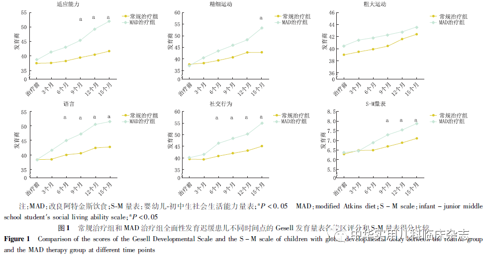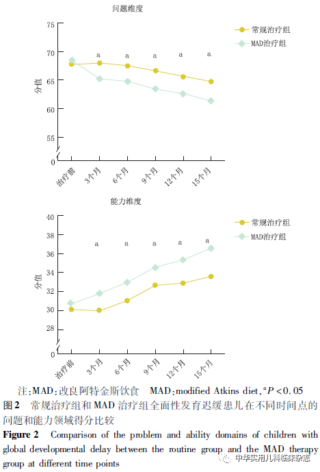资料与方法1.1 研究对象 前瞻性多中心临床对照研究。在河南省八家医院(郑州大学第三附属医院、驻马店市中心医院、濮阳市妇幼保健院、新乡市中心医院、鹤壁市妇幼保健院、漯河市中心医院、濮阳市油田总医院、南阳市中医院)的儿童康复科完成,GDD患儿于2017年7月至10月纳入,每3个月随访1次,共随访15个月。本研究获得郑州大学第三附属医院医学伦理委员会批准(批准文号:2016027),受试者监护人签署书面知情同意书。采用简单随机法分组,将GDD患儿分为2组:常规治疗组(仅康复训练)和MAD治疗组(常规治疗+MAD)。1.2 纳入标准和排除标准 纳入标准:(1)符合DSM-5中 GDD的诊断标准;(2)Gesell发育量表(Gesell Deve-lopmental Scale,GDS)适应性能区和语言能区均<55分,婴幼儿-初中生社会生活能力量表(infant-junior middle school student′s social living ability scale,S-M)评分标准分≤8;(3)头颅磁共振成像、血生化、血液串联质谱和尿有机酸分析未见异常;(4)年龄2~5岁;(5)纳入前3个月未接受KD或MAD治疗;(6)患儿监护人签署知情同意书。排除标准:(1)发热或频繁呕吐等感染性疾病活跃期表现;(2)中重度营养不良、病毒性肝炎、泌尿系统畸形等;(3)有明确的肢体运动障碍或脑性瘫痪;(4)MAD治疗前血液串联质谱和尿有机酸分析已确诊的遗传性代谢性疾病;(5)共患癫痫或脑电图异常。共154例患儿符合纳入标准。其中男72例,女82例;年龄 (34.6±5.3)个月。1.3 干预方法 常规治疗组进行康复训练,包括认知知觉功能训练、语言训练、作业疗法、行为矫正等,1次/d,每周5次,每疗程3周,疗程间隔2周。MAD治疗组患儿除康复训练外同时接受MAD治疗。根据患儿身高和体质量,由营养师计算每日所需热量(251.22~334.96 kJ/kg),限制高生糖指数的食物,碳水化合物占总能量的比例约为10%。无需禁食,从总热量的1/3开始增加,1~2周后到达所需总热量。治疗期间,患儿均适当补充钙、微量元素、维生素和枸橼酸钾。在治疗的第3、6、9、12和15个月,评估患儿体格生长、神经发育和社交行为,血生化、血细胞计数、血脂水平,尿液分析和泌尿系统超声检查,评估不良反应的发生率。隔1周检测1次患儿血酮和血糖水平,调整饮食,确保血酮维持在1.2~4.9 mmol/L、血糖/血酮比值保持在 1~2。1.4 疗效评价 采用GDS对患儿神经发育进行评价。中国幼儿情绪及社会性发展量表(CITSEA)评估3岁以下儿童的情绪和社会行为[12],Achenbach儿童行为量表(CBCL)对4~5岁儿童情绪和社会行为进行评定。S-M量表评定适应性行为。1.5 统计学处理 采用SAS 9.4软件进行统计分析,计数资料以例数表示,组间比较采用χ2检验;呈正态分布的计量资料以x̄±s表示,组间比较采用成组t检验。同一观察对象在不同时间点数据比较,采用重复测量方差分析。P<0.05为差异有统计学意义。