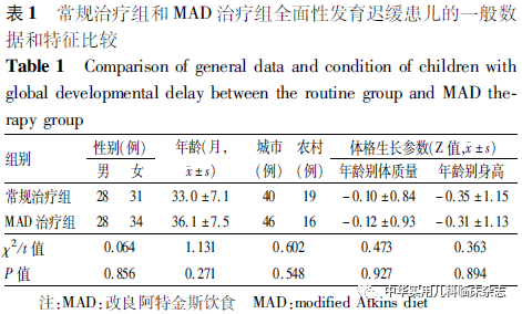 根据第5版《精神障碍诊断与统计手册》(DSM-5)[1],全面性发育迟缓(global developmental delay,GDD)指2个或2个以上标志性里程碑(粗大运动/精细运动、语言、认知、交流能力和社会适应能力)未达到预期发育标志,且无法接受系统性智力评估的患儿,通常GDD的诊断用于5岁以下患儿。如果症状持续到5岁以上,就可以诊断智力障碍(intellectual disorders,IDs)或孤独症谱系障碍(autism spectrum disorders,ASD),重度GDD症状多可持续到5岁以上[1]。GDD的发病率为1%~3%,原因可能与遗传和中枢发育异常有关[2]。除发育落后外,GDD患儿情绪和行为异常的发生率明显高于健康儿童,主要表现为焦虑、兴奋、易怒、多动、冲动、注意力不集中、攻击性、自残等行为,严重影响患儿的生活质量[3-4]。除了某些代谢性疾病引起的GDD外,康复治疗是其主要的治疗策略[5]。生酮饮食(ketogenic diet,KD)用于治疗药物难治性癫痫已有100年历史。高脂低糖的KD模拟饥饿状态,使酮体成为大脑的主要供能来源。KD不仅可控制癫痫发作,还可改善难治性癫痫患儿的神经行为发育和认知能力[6]。此外,KD还可治疗其他神经系统疾病(如创伤性脑损伤、ASD和衰老)引起的认知障碍[7-8]。一项前瞻性研究发现,18例使用KD的ASD患儿认知和行为均有改善[9]。另外一项关于阿尔茨海默病及轻度认知障碍的研究中,血清酮体水平的升高改善了患者的注意力、记忆、语言和实践能力[10]。改良阿特金斯饮食(modified Atkins diet,MAD)是一种限制较少的KD方法,与经典KD不同的是,MAD饮食只需限制碳水化合物的摄入,不需严格限制蛋白质、脂肪的摄入量,因此不良反应更少,易被患者接受[11-13]。本课题组前期研究证实了MAD治疗对于GDD的有效性及安全性[14]。国际上无MAD对未合并癫痫的GDD患儿的有效性研究报道。因此,本研究进行多中心研究,进一步探讨MAD疗法对GDD患儿神经发育、情绪和社会适应行为的影响及安全性的问题。