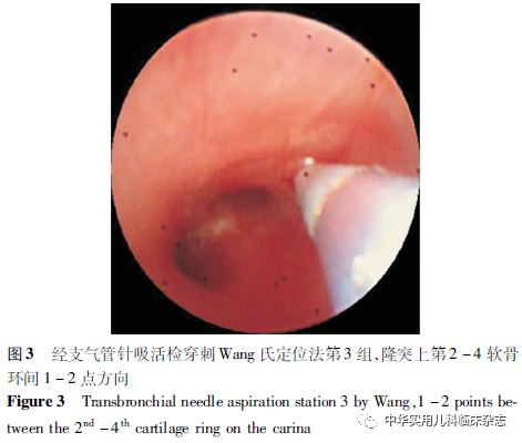 讨论儿童结核病以肺结核为主[5],根据中华医学会儿科学分会呼吸学组制定的儿童肺结核临床诊断标准[6],首先具备:(1)临床表现:发热、咳嗽持续2周以上,或喘息等;(2)胸部X线检査:有各型肺结核的征象,同时满足以下2点之一:①痰液、胃液或支气管肺泡灌洗液结核杆菌涂片或培养阳性;②肺组织病理检査符合肺结核特征,可确诊为肺结核。但儿童获得病原学证据较成人困难,且多数家长无法接受经验性抗结核治疗[7],导致部分疑难病例因无法确诊而病情迁延。在儿童肺结核的发病过程中,肺内原发病灶形成后,可通过淋巴管引流至中央淋巴结导致纵隔或肺门淋巴结大,研究显示纵隔淋巴结大的比例可达92%[1],如能安全、有效地获得纵隔淋巴结活检,对于诊断儿童肺结核意义重大,能够填补常规检查的空白。纵隔镜及开胸探查可获得满意的组织标本,但其创伤、风险较大,难以作为常规的方法在临床上开展。TBNA技术能够对气管、支气管旁及肺门的病灶进行活检,获得细胞或组织标本,创伤小,安全性高,在成人呼吸领域已有大量报道[8-9],是一项经临床验证成熟有效的检查手段。支气管镜检查对于儿童肺结核诊断很有价值[10-11],但儿童TBNA的开展仍面临较多困难。2014年,叶乐平等[12]报道了我国首例儿童TBNA病例,通过检查诊断了1例3岁男童的肺结核,之后未有大样本的临床研究报道,可能原因为:(1)医务人员限制:儿童纵隔淋巴结大的疾病谱与成人差异较大,适用TBNA技术的病例基数少,导致儿科呼吸介入医师不易熟练掌握此项技术。(2)设备限制:婴幼儿病例较多,如本组病例中,有6例<3岁(75.0%),对麻醉设备、检查设备(支气管镜、穿刺针)提出了更高的要求。(3)穿刺部位限制:本组8例患儿根据Wang氏穿刺位点,9组(右下肺门淋巴结)4例,1组(前隆突淋巴结)、3组(右气管旁淋巴结)、4组(左气管旁淋巴结)、5组(右主支气管淋巴结)组各1例,右侧穿刺点占75.0%,均为无需将支气管镜在气道过于弯曲的穿刺点,在部分未纳入研究的病例中,存在因操作受限而无法完成检查的问题。(4)依从性限制:很多家长拒绝为患儿行介入、有创的检查。虽然存在上述问题,但开展TBNA仍然很有价值,在本研究病例中,6例患儿通过TBNA获得了诊断证据,诊断率75.0%,有3例(37.5%)TBNA是阳性结果的唯一来源,如未行TBNA检查,这3例患儿可能出现漏诊或诊断困难。本研究患儿中2例未通过TBNA获得阳性诊断结果,可能与取材部位、病变时期、操作技巧有关,也提示在一次内镜检查中,除完善TBNA外,也应行肺泡灌洗、黏膜活检等检查,尽可能提高诊断阳性率。为了更有效、安全地开展儿童TBNA技术,需注意:(1)掌握儿童TBAN检查适应证,避免遗漏应检病例;(2)熟练掌握纵隔解剖结构、胸部强化CT阅片技巧及Wang氏TBNA穿刺定位法;(3)熟练掌握支气管镜操作及 TBNA 穿刺技巧;(4)结合快速现场评价(ROSE)[13],可提高TBNA的诊断率。本研究病例年龄7个月~8岁6个月,年龄差异对TBNA操作影响:婴幼儿管腔纤细,检查操作空间小,穿刺点选择受限,对术者的内镜操作技术提出了更高的要求,但软骨环尚未钙化,进针阻力小,无需特意选择软骨环间穿刺。学龄期儿童气道操作空间较大,便于内镜弯曲出针,可选择穿刺位点较多,但软骨环较硬,需选择软骨环间穿刺。TBNA技术主要并发症为穿刺部位的少许自限性出血[14],一般无需处理或局部应用肾上腺素处理即可。其他可能出现的并发症,如大量出血、纵隔积气、气胸等,据研究报道发生概率极低[15]。本研究中8例患儿术中、术后均未出现相关并发症,提示TBNA在儿童也可安全应用。除常规TBNA外,国外有相关研究开展超声引导下TBNA[16],目前国内尚未见报道,可作为进一步研究及技术开展的方向。综上,TBNA在儿童纵隔淋巴结大肺结核诊断中可发挥重要作用,能减少漏诊、误诊的发生,随着儿科呼吸介入技术的普及发展,新型支气管镜、穿刺针的问世,该项技术将更好地服务于儿科临床工作,具有临床应用价值。