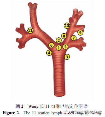 资料与方法1.1 研究对象 回顾性分析。选择山东大学附属儿童医院2014年3月至2019年7月经胸部强化CT诊断纵隔淋巴结大后行TBNA,并最终确诊为肺结核的患儿。纳入标准:(1)病例资料详实、完整;(2)有TBNA适应证[4],并完成了TBNA检查;(3)最终诊断为肺结核。依据纳入标准共入组8例患儿,其中男3例,女5例。术前均征得患儿监护人同意并签署知情同意书,本研究经山东大学附属儿童医院医学伦理委员会批准通过(ETYY-2020226)。1.2 方法 1.2.1 资料收集 收集患儿一般信息、临床资料、支气管镜检查结果、影像学检查结果、治疗和转归等信息。1.2.2 检查设备 (1)电子支气管镜:采用日本 Olympus 公司生产的EVIS LUCERA BF-260型系列电子支气管镜:BF-P260F(外径4.0 mm)。(2)TBNA穿刺针:细胞穿刺针:conmed sw-121;组织穿刺针:conmed mw-319。1.2.3 检查方法 术前根据胸部强化CT扫描(图1),结合Wang氏11组淋巴结定位法(图2)[4],初选穿刺靶点。采用喉罩全身麻醉,选择外径4.0 mm、工作孔道2.0 mm的Olympus支气管镜进行检查。术中根据实际管腔内空间、气道走行进一步确认穿刺位置。先用细胞穿刺针,通过支气管镜工作通道送入针鞘至越过镜身弯曲部,操作内镜前端靠近穿刺点,先后伸出针鞘、穿刺针并锁定,术者左手或助手在工作孔道开口处固定针鞘位置,调整内镜角度,使镜身尽量与穿刺点管壁垂直,推动支气管镜使穿刺针突破管壁到达病变部位(图3)。通过专用注射器抽吸维持负压,保持针尖于黏膜下,反复抽送穿刺针,获得更多样本。活检完成后,将穿刺针收回针鞘退出工作孔道,将针管内的标本喷涂在灭菌载玻片上,涂匀后送检寻找抗酸杆菌及癌细胞。如条件允许,再换用组织穿刺针,获取组织学标本,取样后用甲醛固定做病理切片。术后检查穿刺部位有无出血,如有少许出血可予1∶10 000肾上腺素1 mL局部喷撒止血。TBNA 术后再完善支气管镜下肺泡灌洗、活检等检查。