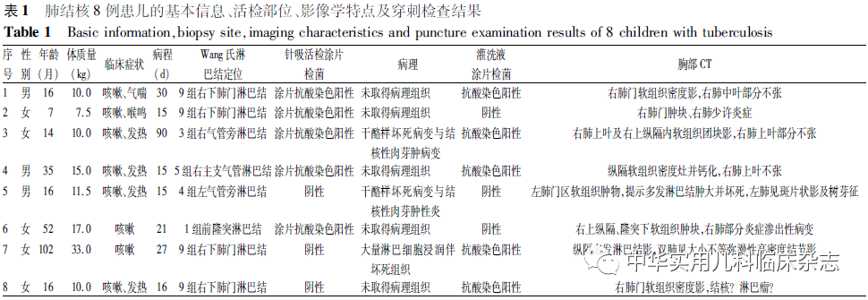 在儿童肺结核患者中,纵隔淋巴结大的比例很高[1],如能有效、安全地取得淋巴结活检,对于结核杆菌感染的诊断有很大帮助。经皮超声、CT、磁共振成像(MRI)引导穿刺创伤小,但取材部位、精准度受限,纵隔镜、开胸活检风险及创伤大。1983年,Wang等[2]发明了Wang氏经支气管细胞针,经支气管针吸活检术(transbronchial needle aspiration,TBNA)逐步推广于临床应用,因其创伤、风险小,诊断有效率高,已逐渐成为成人纵隔淋巴结大患者诊断的常规手段[3]。但在儿童中,TBNA 的开展仍受器材及操作难度的限制,国内外报道较少。本研究总结8例肺结核患儿的临床资料及利用 TBNA 诊断纵隔淋巴结大肺结核的经验,探讨其临床价值。
