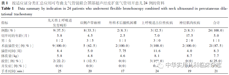 讨论气管切开是解救急性上呼吸道困难的有效措施。回顾气管切开发展简史,15世纪早期,意大利医师AntonioMusa Brassolva首次报道了成功的气管切开术,以缓解扁桃体肿大引起的气道阻塞。然而,直到20世纪初才发表了关于气管切开术的充分文献研究,Chevalier Jackson将气管切开手术进行了标准化[8]。从那时起,气管切开术也开始成为儿科处置严重气管损害或上气道阻塞患者的一种重要手术[9]。儿童气管切开的适应证随着医学诊疗技术的进步而不断变化与发展。在广泛接种流感嗜血杆菌、白喉棒状杆菌疫苗之前,急性病毒和细菌感染,如白喉、急性会厌炎、喉气管炎,是导致儿童气管切开术的主要原因[10-11],随着抗感染治疗及气管插管技术的发展,因感染导致的气管切开已经罕见,而上呼吸道梗阻(先天性或继发于长期气管插管)、需要延长机械通气的病例数显著增加[12-13],也更常见于患有慢性疾病的儿童,包括神经功能障碍和先天性心脏和肺部疾病[14],现阶段儿童气管切开的主要适应证包括:(1)需长期机械通气支持治疗;(2)先天或后天的神经系统疾病;(3)颅面疾病伴上气道阻塞;(4)获得性或先天性声门、声门下或气管狭窄;(5)先天性高气道阻力综合征;(6)急性上呼吸道感染(会厌炎、气管炎、白喉)[15]。本研究24例患儿中,先天性上呼吸道发育畸形9例,双侧声带麻痹8例,外科术后撤机困难2例,上呼吸道占位性疾病3例,神经肌肉疾病2例。其中先天性疾病占比最高,与该年龄组的疾病特点相符。本组患儿中5例存在喉狭窄,经喉气管插管困难,有气管切开指征,但当地医院并未行气管切开术,而是插入更细的气管插管,即使这会影响通气量、增加痰液堵塞的风险及护理的难度,这可能反映了婴幼儿气管切开对于大多数临床中心都是一个困难的选择。传统气管切开术是经颈前入路的开放性手术,一般需耳鼻喉科或头颈外科医师在手术室完成,手术过程比较复杂,并发症较高,Dal′Astra 等[16]研究显示,最常见的并发症为肉芽增生、感染、插管阻塞、意外脱管和脱管后气管皮肤瘘,而Watters[9]详细总结了包括婴幼儿在内的气管切开术并发症,包括:(1)气漏:气胸、纵隔气肿、皮下气肿;(2)大出血:甲状腺、迷走血管、无名动脉;(3)周围组织损伤:环状软骨、食管、喉返神经;(4)肺水肿;(5)呼吸暂停;(6)置管相关损伤:气管撕裂/瘘管;(7)气道阻塞:痰痂、意外脱管。15%~19%的儿童经历了与气管切开术相关的并发症。随着医学技术的进展,Ciaglia等[17]于1985年首次报道了PDT,目前已在很大程度上取代了成人患者的传统气管切开术,被认为是一种更安全和简单的床边手术,不损害气管软骨,皮肤切口也更美观。Melloni等[18]进行了前瞻性随机对照研究,证实PDT较开放式气管切开术更简单、快速,术后并发症发生率较低。然而,由于成人和儿童喉部解剖与生理特点的差异,婴幼儿PDT常被认为是不安全与难以实施的,主要因为[9]:(1)喉部解剖差异:婴儿的颈部较成年人更短,皮下脂肪更厚。婴儿喉部位于颈部第三或第四颈椎的上方,在2岁左右开始下降。它的大小约是成人喉部的1/3。成人的喉部位于第六或第七椎体。儿童甲状软骨切迹不明显,环甲膜也更短,不易触摸解剖标志,因此定位穿刺较困难。(2)生理差异:婴儿的喉部软骨较成人更软、更柔韧,如果对其施加压力,较成人更易塌陷,穿刺、扩张时易损伤气管后壁。(3)病因差异:先天性喉-气管发育异常是儿童进行气管切开术的主要病因,术前要进行充分评估,如先天性声门下区狭窄或气管狭窄伴完全性气管环,若穿刺位置不合适,气切套管可能难以进入气道,并有损伤气管的风险。不过,随着PDT技术的日益成熟,出现了越来越多成功开展儿童PDT的报道,Toursarkissian等[19]首次报道11例青少年(男7例,女4例)接受了PDT手术,年龄为(16±3)岁(10~20岁);手术平均时间为20 min;8例患者在床边进行PDT治疗,8例拔管患者在拔管后平均随访43周未出现气管狭窄,提示PDT对于青少年(>10岁)可能是一种安全、有效替代开放气管切开术的方法。Zawadka-Glos等[20]建议选择较大的非急症儿童进行PDT。Raju等[21]报道PDT可在外伤青少年中实施。Wood等[22]报道在英国已有多家儿童重症监护室成功开展PDT。Gollu等[23]报道了51例患儿,年龄(38±54)个月(1个月~17岁),其中6例患儿在可弯曲支气管镜引导下完成,45例患儿在硬质支气管镜引导下完成,仅出现1例术中并发症:食管穿孔,作者根据临床研究认为PDT是一种对小婴儿同样有效的手术方式。并建议在手术室和硬质支气管镜引导下进行手术。虽然PDT较开放式气管切开术具有微创、便捷的优势 ,但因其为盲法穿刺,需要术者具备较高的操作技巧及经验,术中及术后也会发生出血、皮下气肿或气胸、切口感染、气管食管瘘等并发症[24] 。主要原因如下:(1)误穿甲状腺或血管:(2)气管旁误穿及反复穿刺、扩张;(3)穿刺时过度压迫气管导致损伤气管后壁。通过支气管镜联合颈部超声引导将PDT全程可视化,可有效避免上述问题,减少并发症的出现,其优势在于:(1)术前利于床旁超声判断甲状腺位置及颈部大血管走行,回避甲状腺及血管;(2)支气管镜二次定位穿刺点,避免损伤环状软骨;(3)支气管镜实时监视穿刺进针角度及深度,避免气管旁误穿及气管后壁受损;(4)支气管镜实时监视弯钳扩张过程,避免过度扩张及气管后壁损伤。因此,本组24例患儿在支气管镜联合颈部超声辅助下,均一次穿刺成功,且未出现术